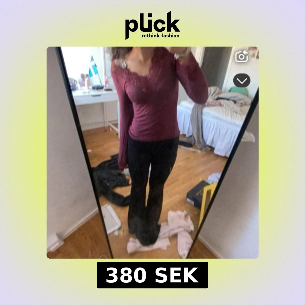 Säljer en vinröd långärmad topp med v-ringning och fina spetsdetaljer längs halsringningen. Toppen är figurnära och passar perfekt till både jeans och kjol. Superfin färg och mjukt material.
