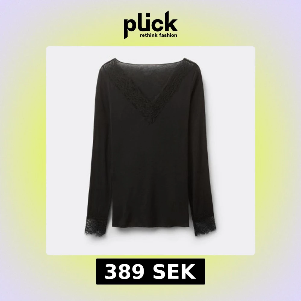 Supersnygg svart långärmad topp med v-ringning och spetsdetaljer både vid halsringningen och ärmsluten. Tunn och mjuk känsla, perfekt att styla med jeans eller kjol. Sitter tajt och har en feminin vibe.