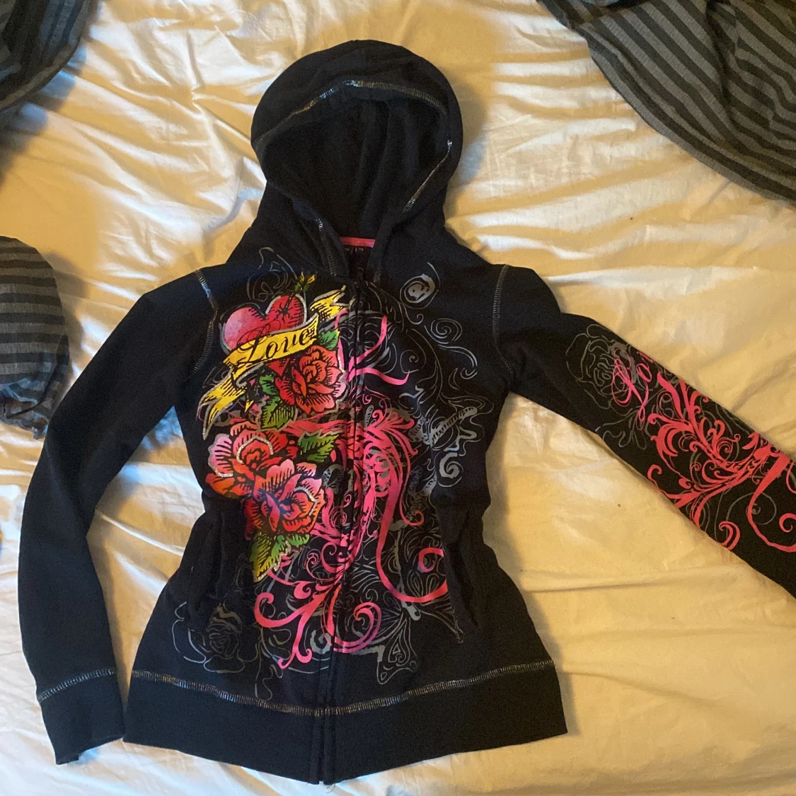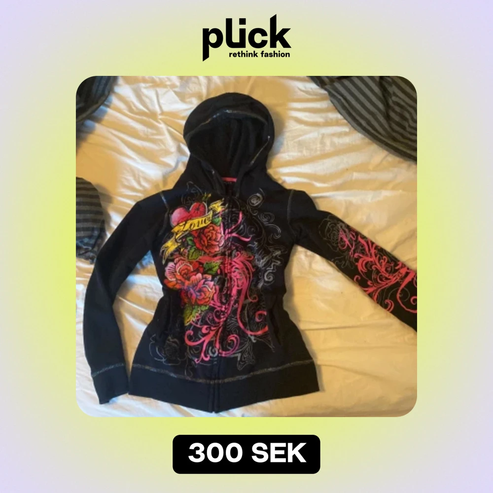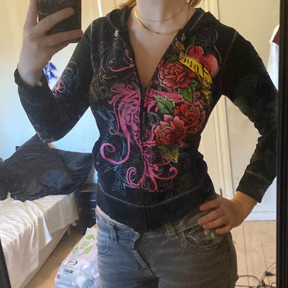 Ed Hardy liknande tröja från WeTWeens i storlek 146/152 som jag skulle likna med XS/XXS. Jag har vanligtvis S i storlek men passar mig helt ok. Väldigt cool tröja som jag köpte i hopp om att använda men det är inte riktigt min stil mer…