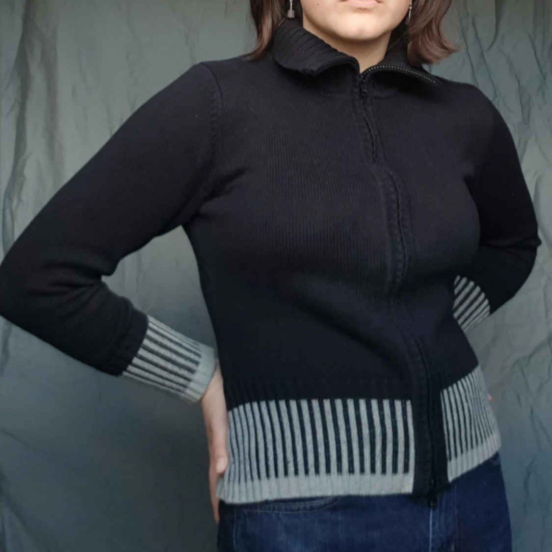 Snygg svart tröja med dragskedja och grå nertill. Egentligen stlk 34/36, passar tajt på mig som vanligtvis är M. ☻💂♀️🗣🕴🖤🕶💣🐧🕷🎱 Betalning via swish, kan mötas upp i malmö, annars står köparen för frakten. Kolla min profil för mer fina grejor