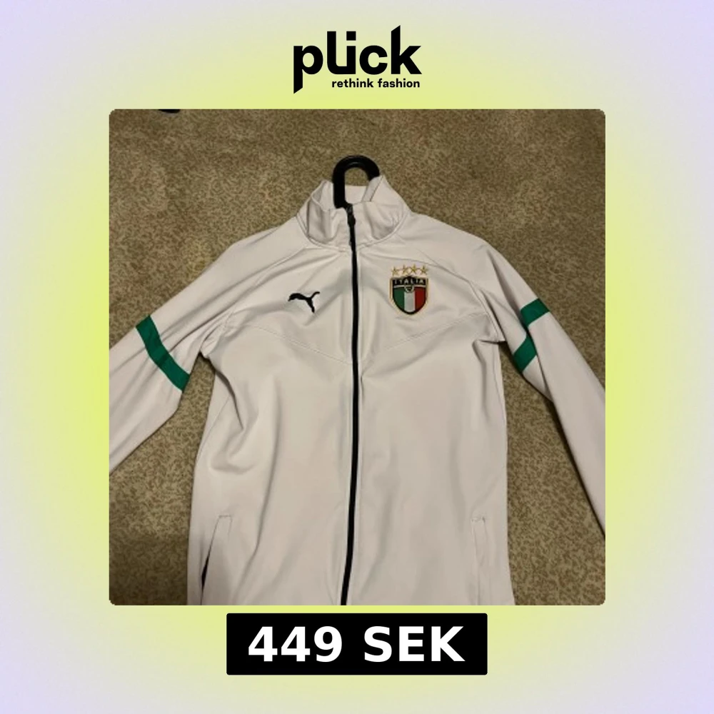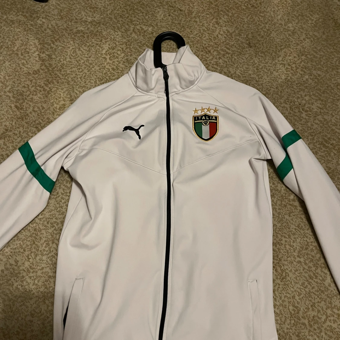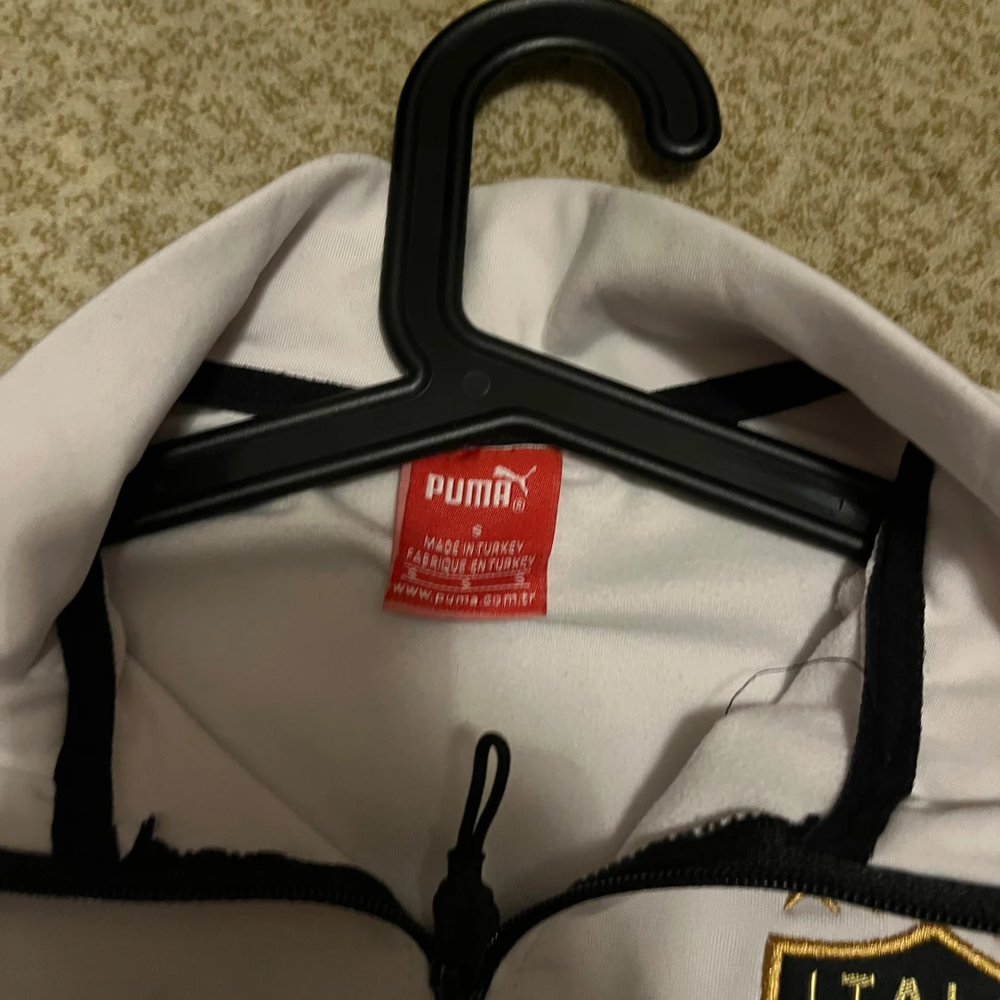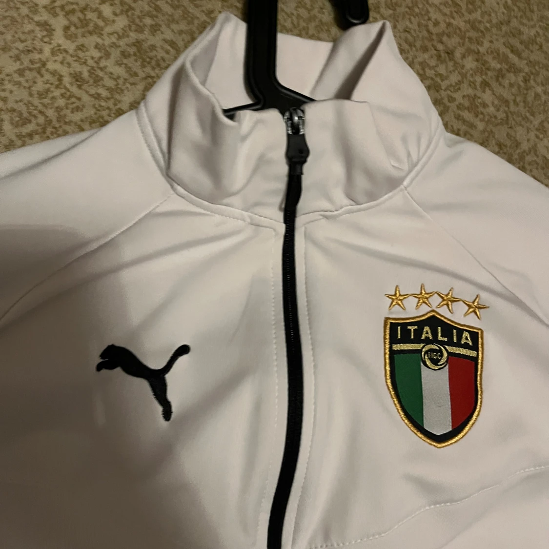 Snygg vit långärmad fotbollströja från Puma med Italiens landslagsemblem på bröstet och svarta detaljer. Dragkedja framtill och gröna ränder på ärmarna. Perfekt för dig som vill visa ditt stöd för Italien. Materialet är polyester.