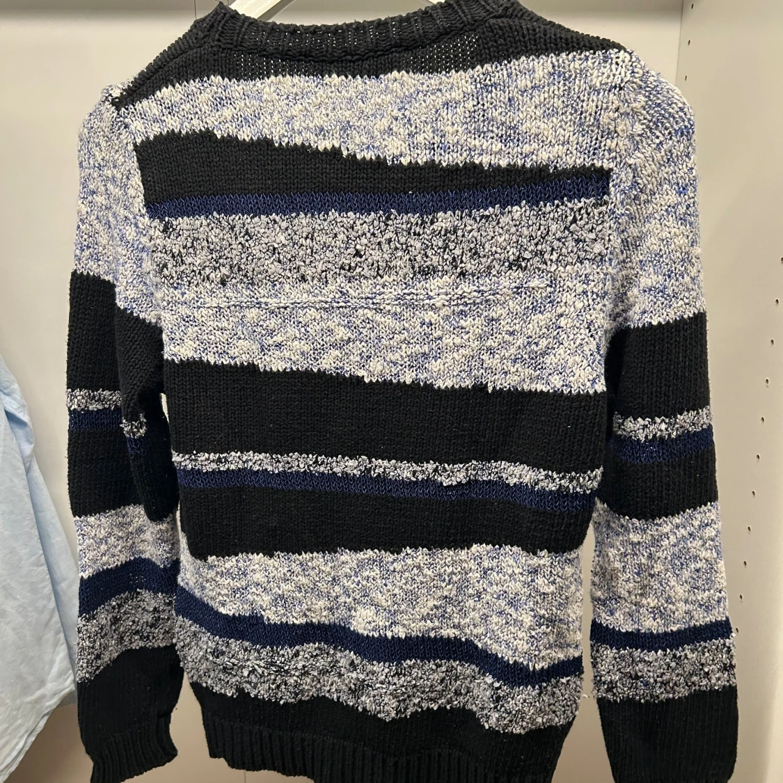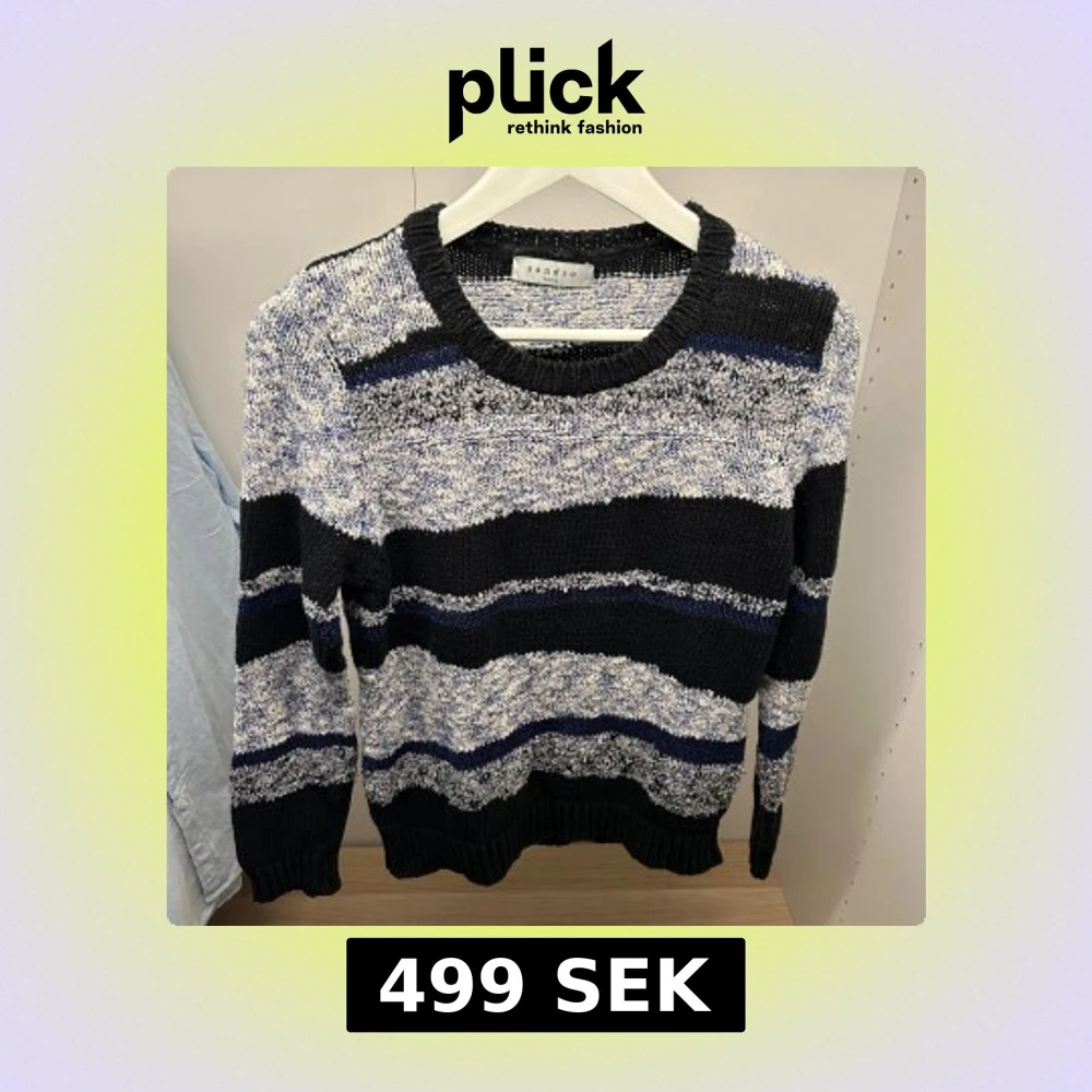 Passar S i dam och XS i herr. Snygg stickad tröja från Sandro Paris med breda ränder i svart, vit och marinblå. Rund halsringning och ribbade muddar vid ärmslut och nederkant. Materialmix av bomull, akryl, polyamid, viskos och polyester. Perfekt för dig som gillar en chill och trendig look.
