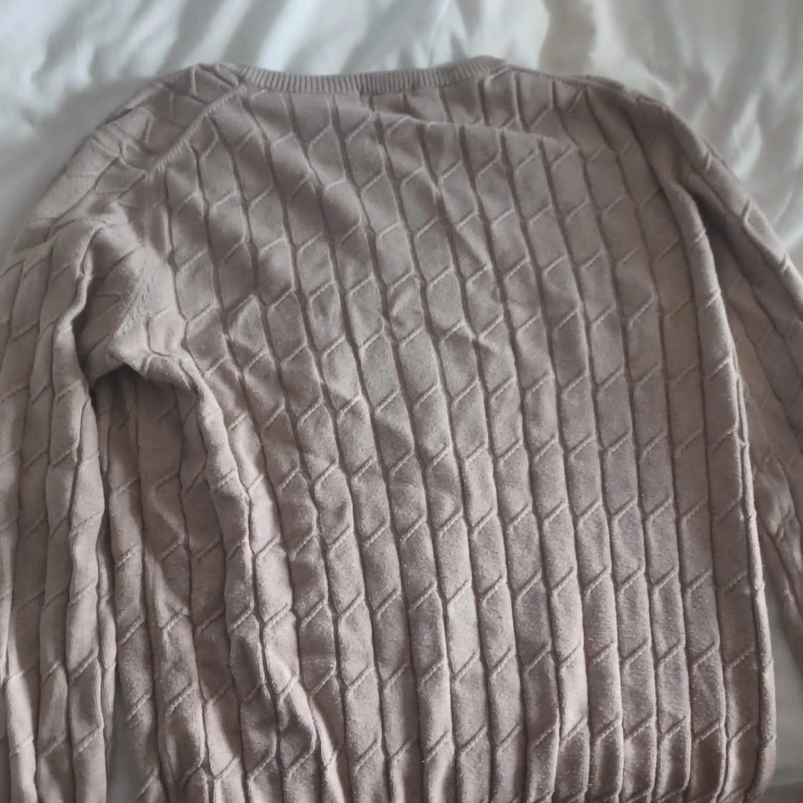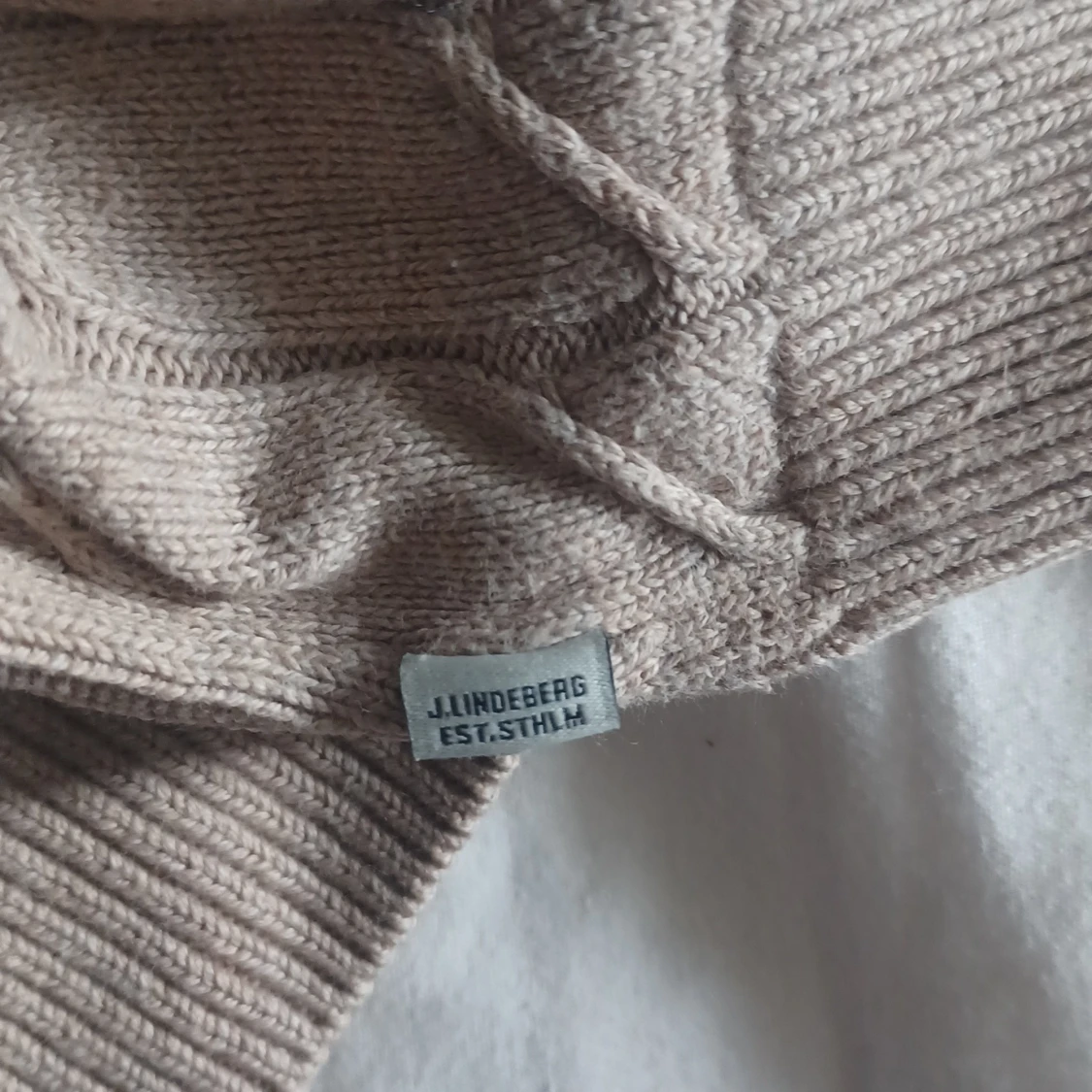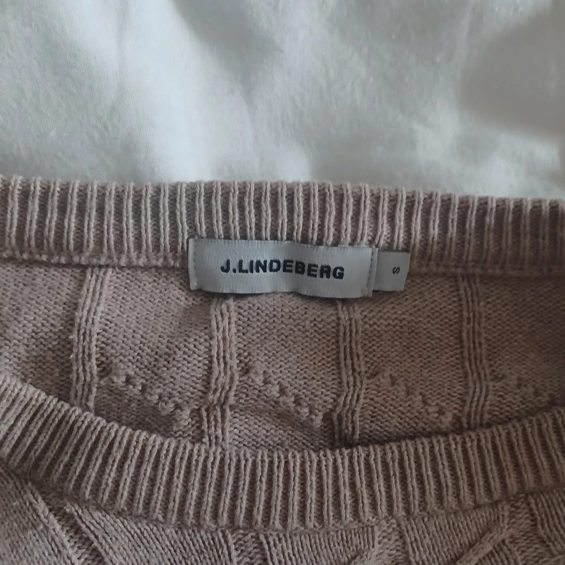 Säljer en beige stickad tröja från J.Lindeberg i storlek S. Tröjan har ett snyggt strukturmönster med diamantformade rutor, rund halsringning och ribbade muddar vid ärmslut och nederkant. Perfekt för dig som gillar stilrena och bekväma plagg.