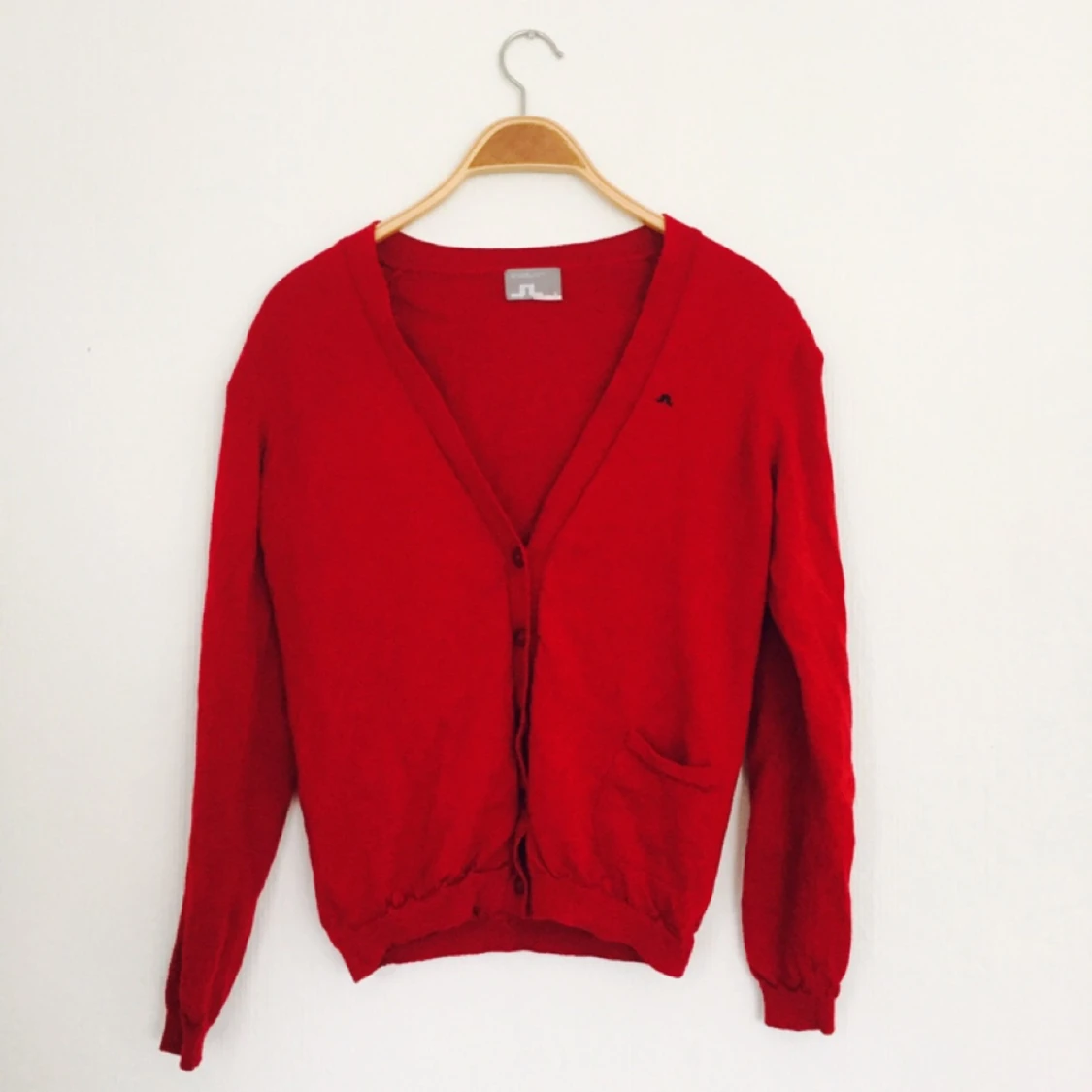Röd Cardigan, J.Lindeberg, strl medium. Använd fåtal gånger, mycket mjuk och skön i materialet.
