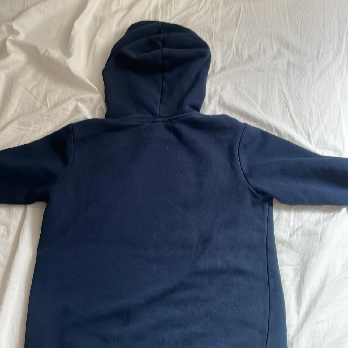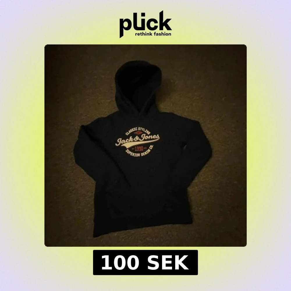 Säljer en blå hoodie från Jack & Jones med tryck i vitt och gult på bröstet. Tröjan har en klassisk design med huva och långa ärmar. Perfekt för en avslappnad stil.