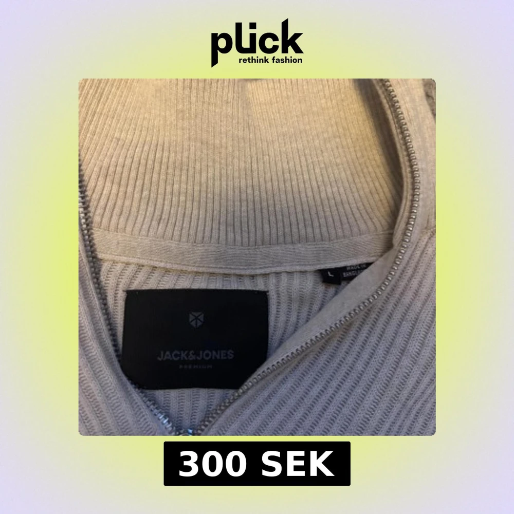 Ribbstickad beige tröja från Jack & Jones med half zip och hög krage. Långärmad modell i mjukt material, perfekt för dig som gillar stilren och enkel design. Snyggt strukturmönster och diskret logga på insidan av kragen. Pris kan diskuteras. Helt oanvänd.