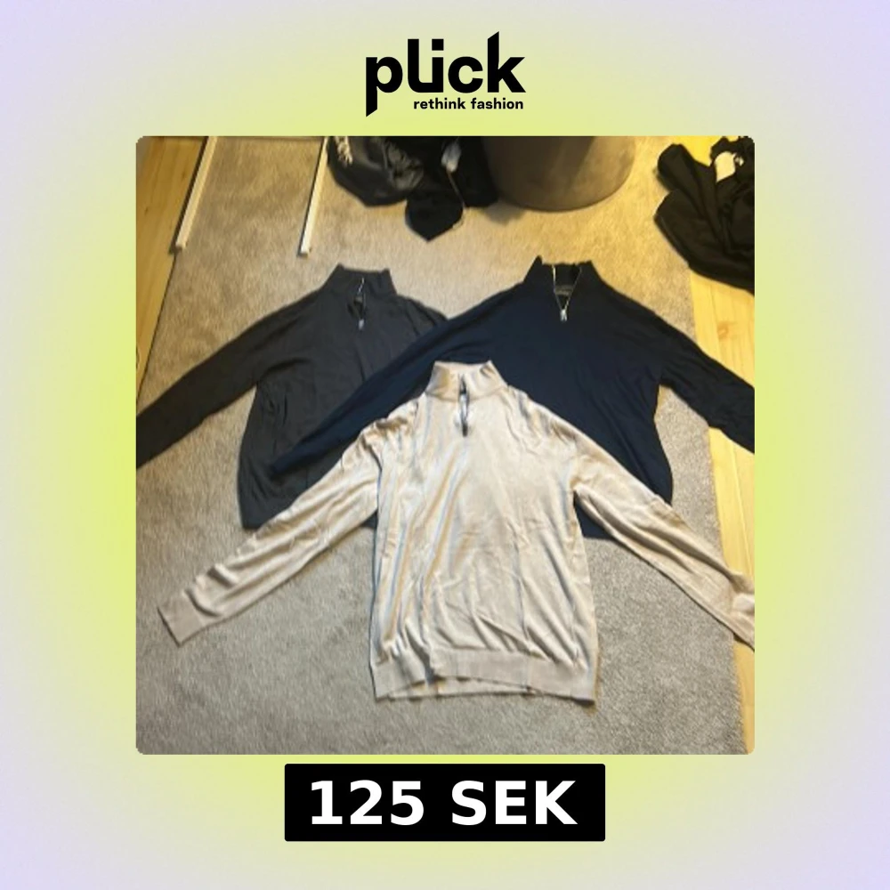 Säljer tre halv-zip tröjor i olika färger: mörkgrå, marinblå och beige. Alla har långärmad design och ribbade muddar vid ärmslut och nederkant. Inga skador eller vidare och användning märks knappast, säljer tröjorna för 125kr/st
