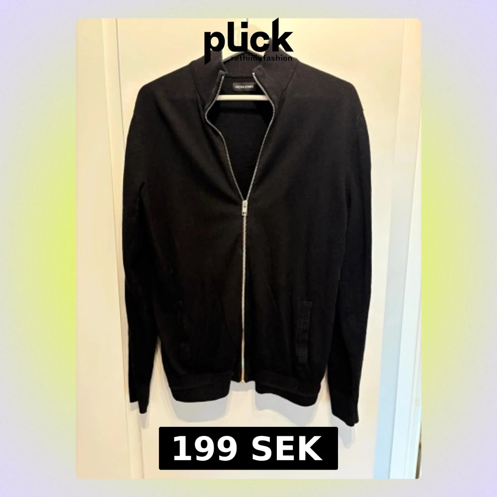 Svart ziptröja från Jack & Jones med hög krage och hel dragkedja framtill. Storlek L men passar som M! Nytt skick.