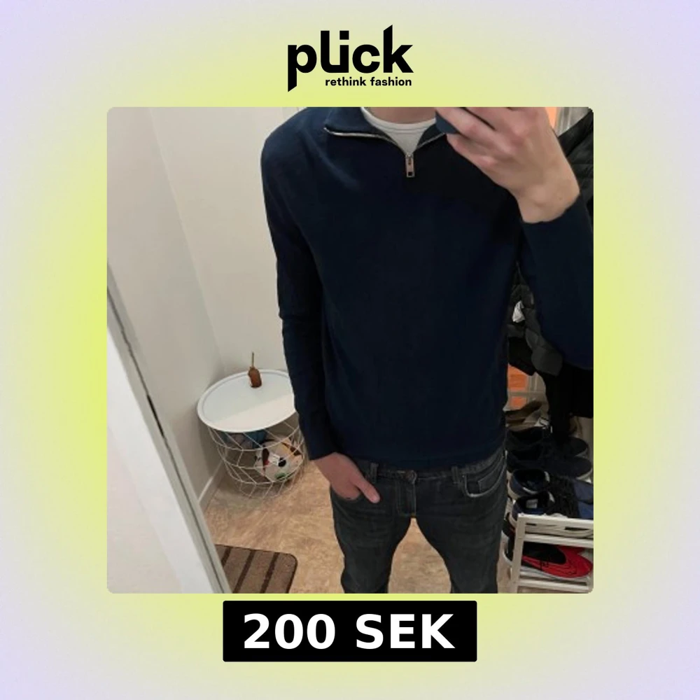Säljer en stilren mörkblå långärmad tröja från Jack & Jones med halv dragkedja vid halsen.