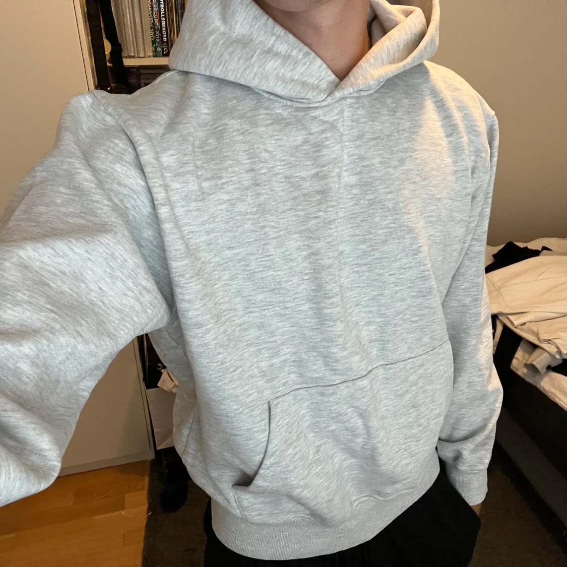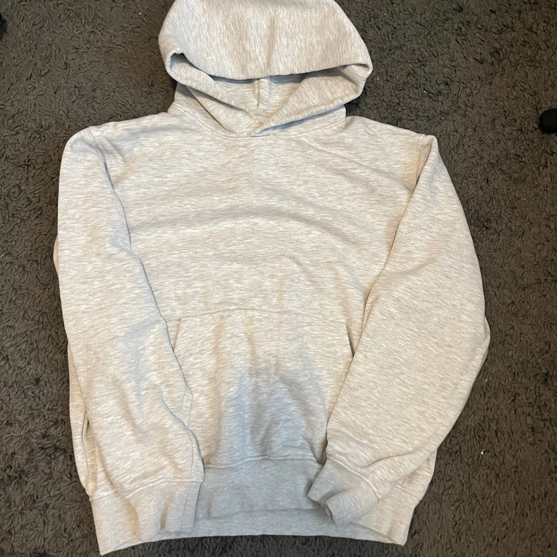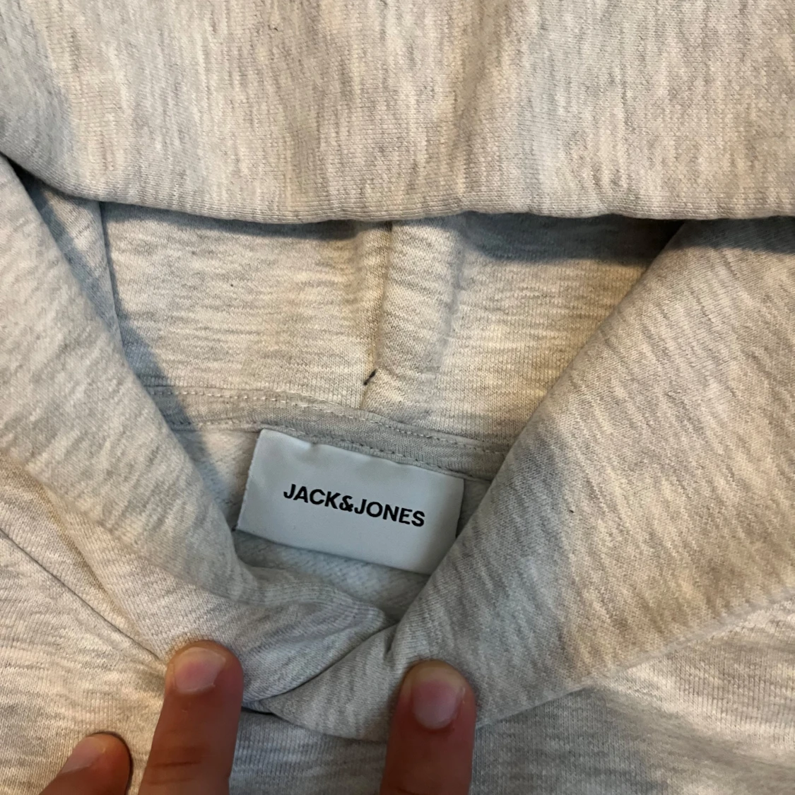 Säljer en stilren ljusgrå hoodie från Jack & Jones. Tröjan har en klassisk huva, stor magficka och ribbade muddar vid ärmslut och nederkant. Perfekt för chill dagar och enkel att matcha med jeans eller joggers. Materialet är mjuk bomull för skön komfort.