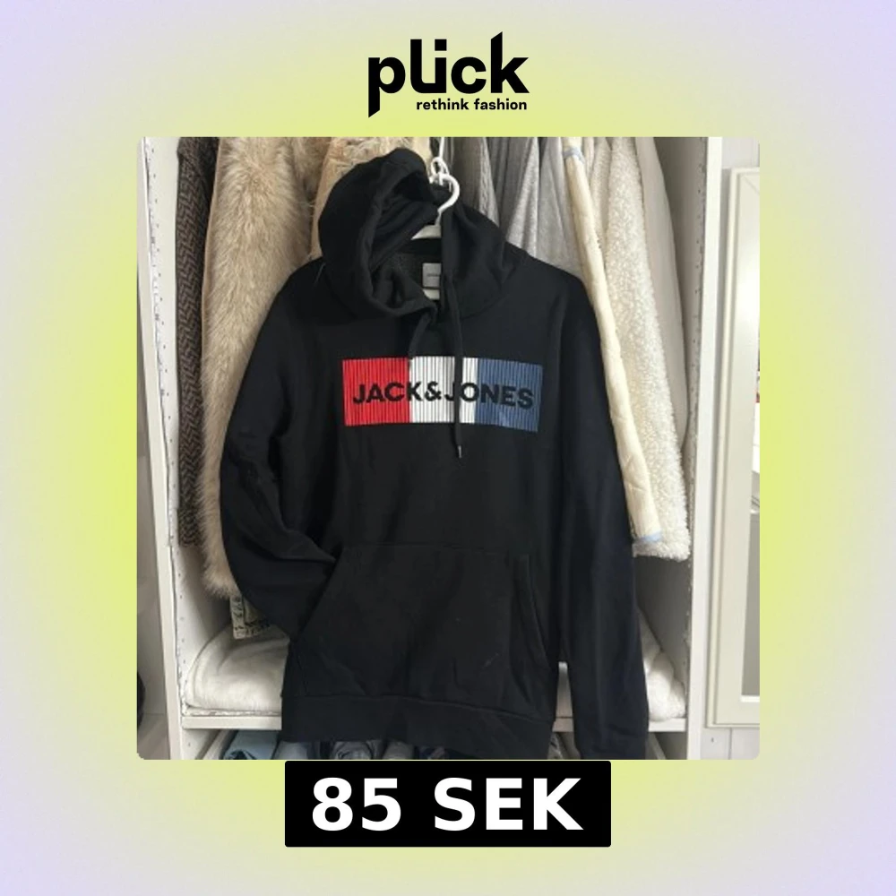 Svart hoodie från Jack & Jones med stor logga framtill i rött, vitt och blått. Tröjan har huva med snörning och en klassisk känguruficka. Tillverkad i mjuk bomullsmix, perfekt för chill dagar eller när du vill ha en clean streetstyle.