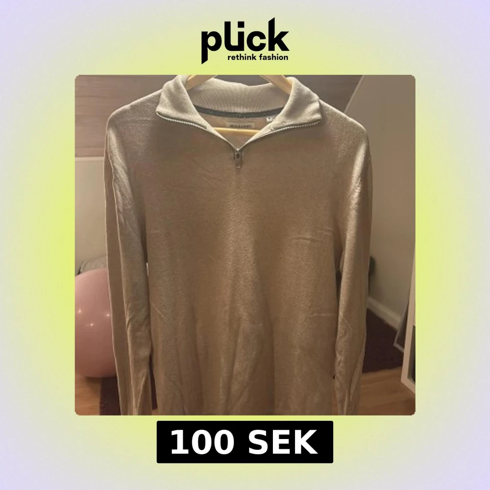 Säljer en stilren beige tröja från Jack & Jones med dragkedja vid halsen. Tröjan har långa ärmar och en mjuk känsla, perfekt för kyligare dagar. Passar bra till både jeans och chinos.