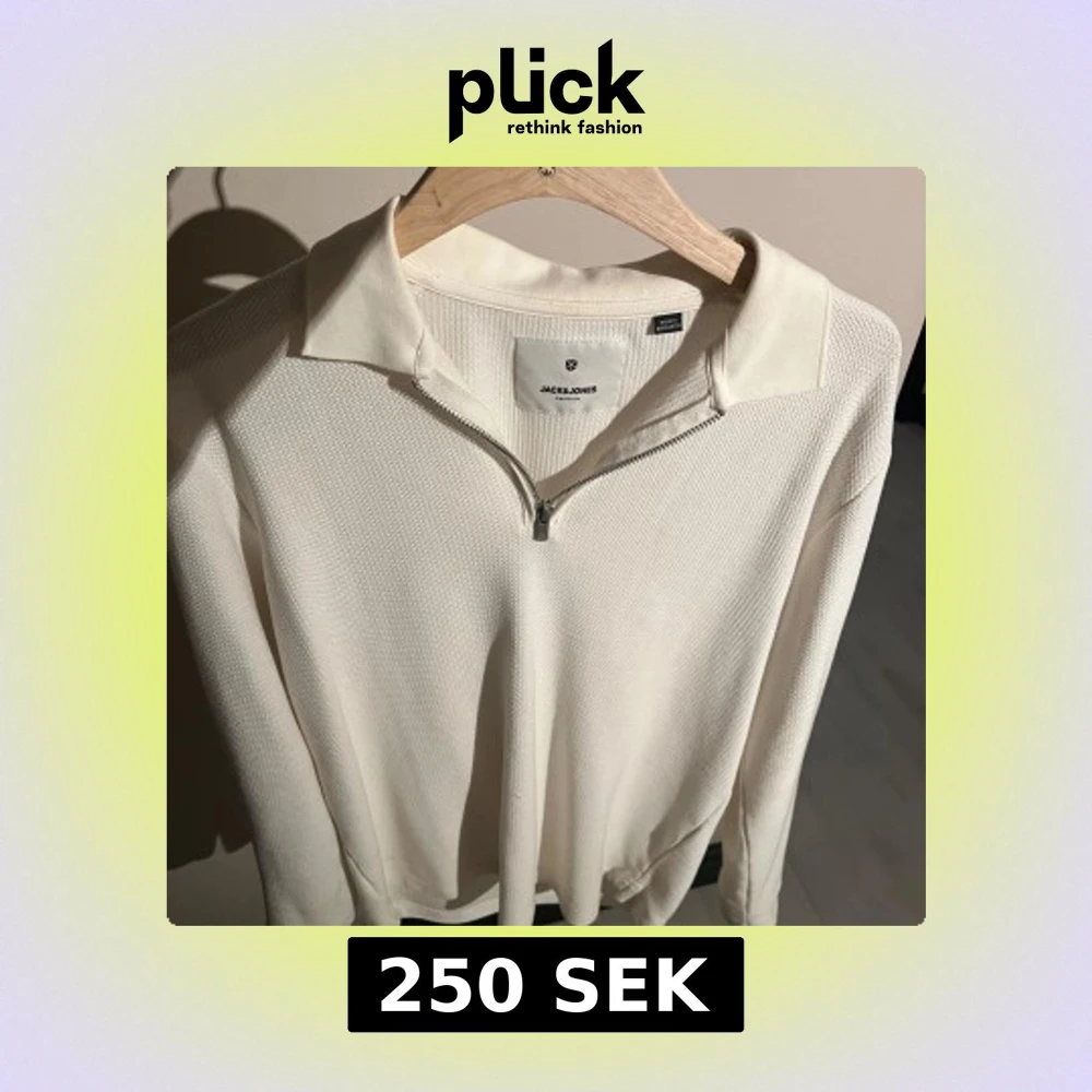 Säljer en stilren vit tröja från Jack & Jones med dragkedja och krage. Tröjan har en enkel design och är perfekt för en avslappnad look. Passar bra till både jeans och chinos.