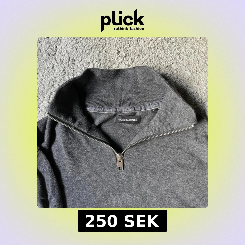 Snygg mörkgrå långärmad tröja från Jack & Jones med half zip-dragkedja i halsen. Tröjan har ribbade muddar och är tillverkad i mjuk bomull, perfekt för chill dagar. Enkel design som funkar till jeans eller chinos. Passar Storlek S och är oanvänd