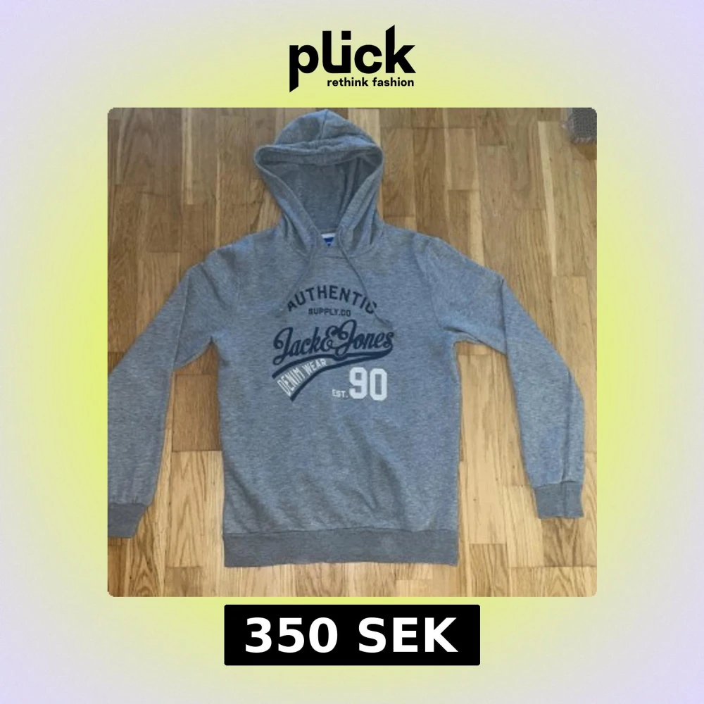 Säljer en grå hoodie från Jack & Jones med tryck i mörkblått och vitt på bröstet. Tröjan har huva med snörning och långa ärmar, samt ribbade muddar vid ärmslut och nederkant. Perfekt för chill dagar och streetstyle. Tröjan är i storlek S. Tröjan är i jätte bra skick och ifall ni har några funderingar kom dm.
