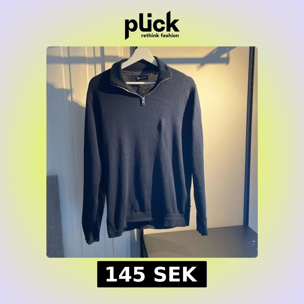 Säljer en stilren mörkblå tröja från Jack & Jones. Tröjan har en dragkedja vid halsen och långa ärmar.