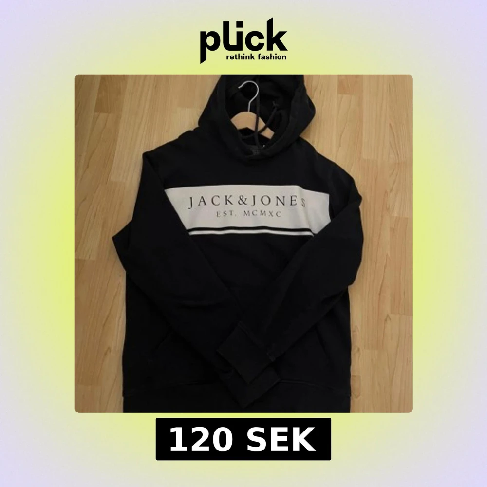 Säljer en svart/marinblå hoodie från Jack & Jones med vit panel och text på bröstet. Den har en klassisk design med huva och långa ärmar. Perfekt för en avslappnad stil.