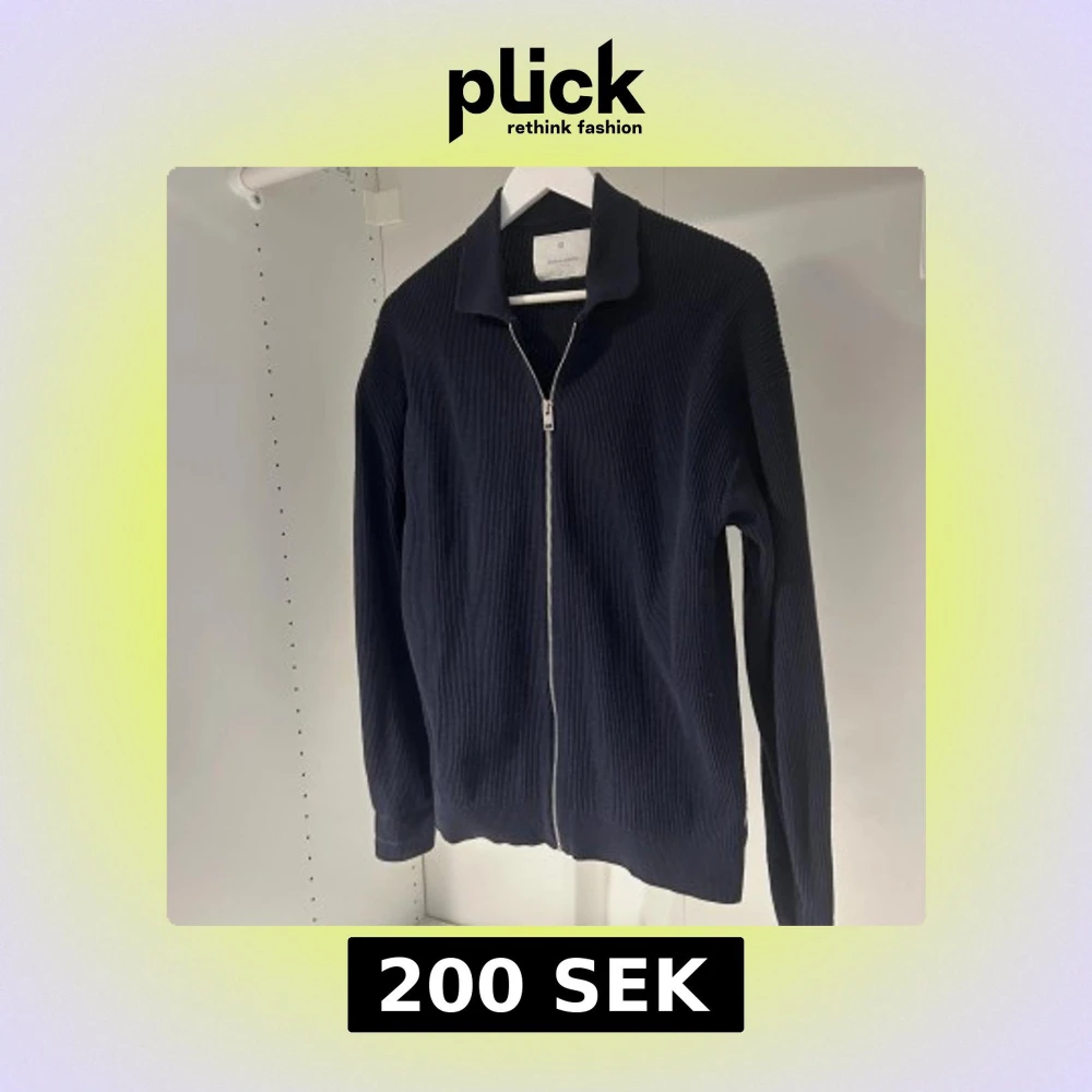 Säljer en mörkblå stickad kofta med hel dragkedja framtill och klassisk krage. Tröjan är använd en gång och är då i riktigt bra skick. Storleken är konstig då det står XS men passar S/M med,