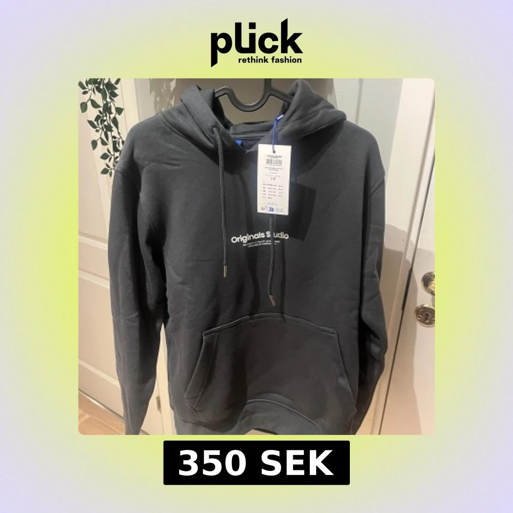 Säljer en snygg mörkgrå hoodie från Jack & Jones med texten 'Originals Studio' på bröstet. Den har en klassisk känguruficka och justerbar dragsko i huvan. Perfekt för en avslappnad stil.
