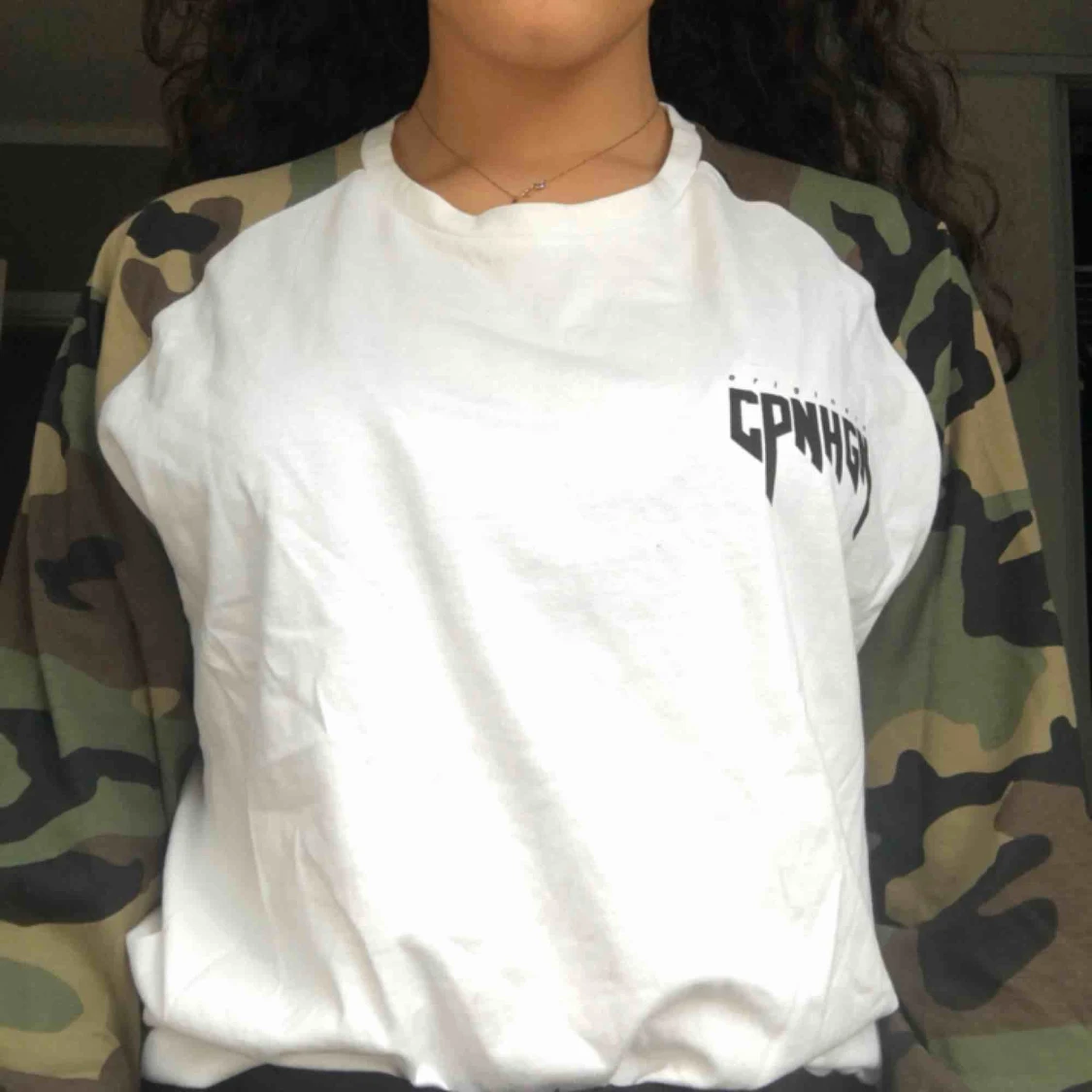 Vit långärmad tröja med camouflageärmar. Står i storleken M men funkar även om man har storlek S, då den blir lite oversized. Köparen står för frakt, Annars kan jag mötas upp i Stockholm