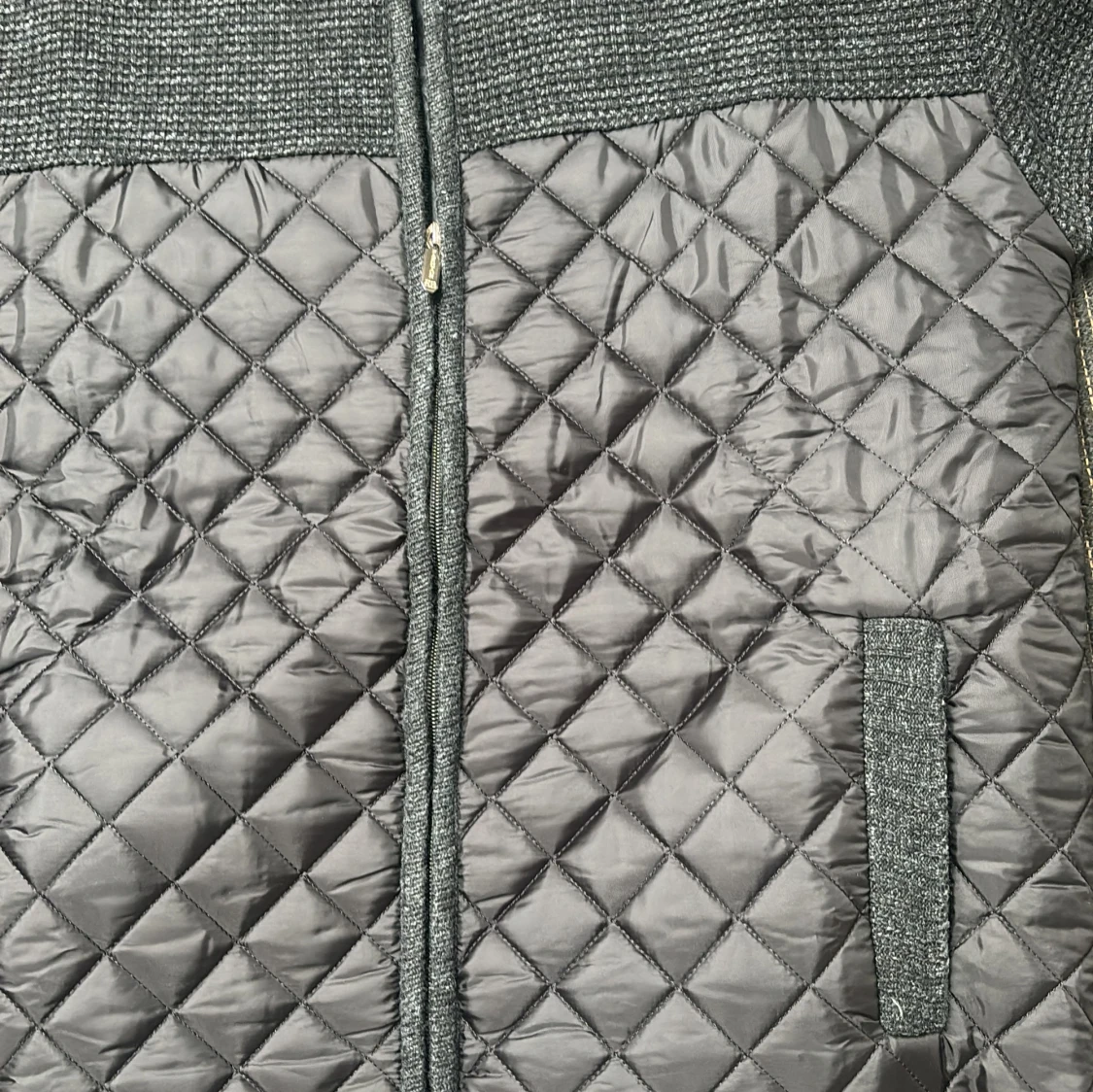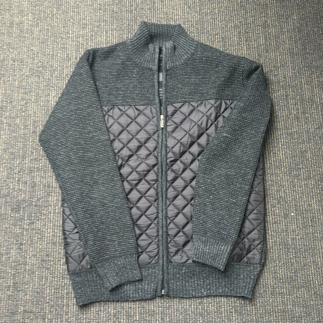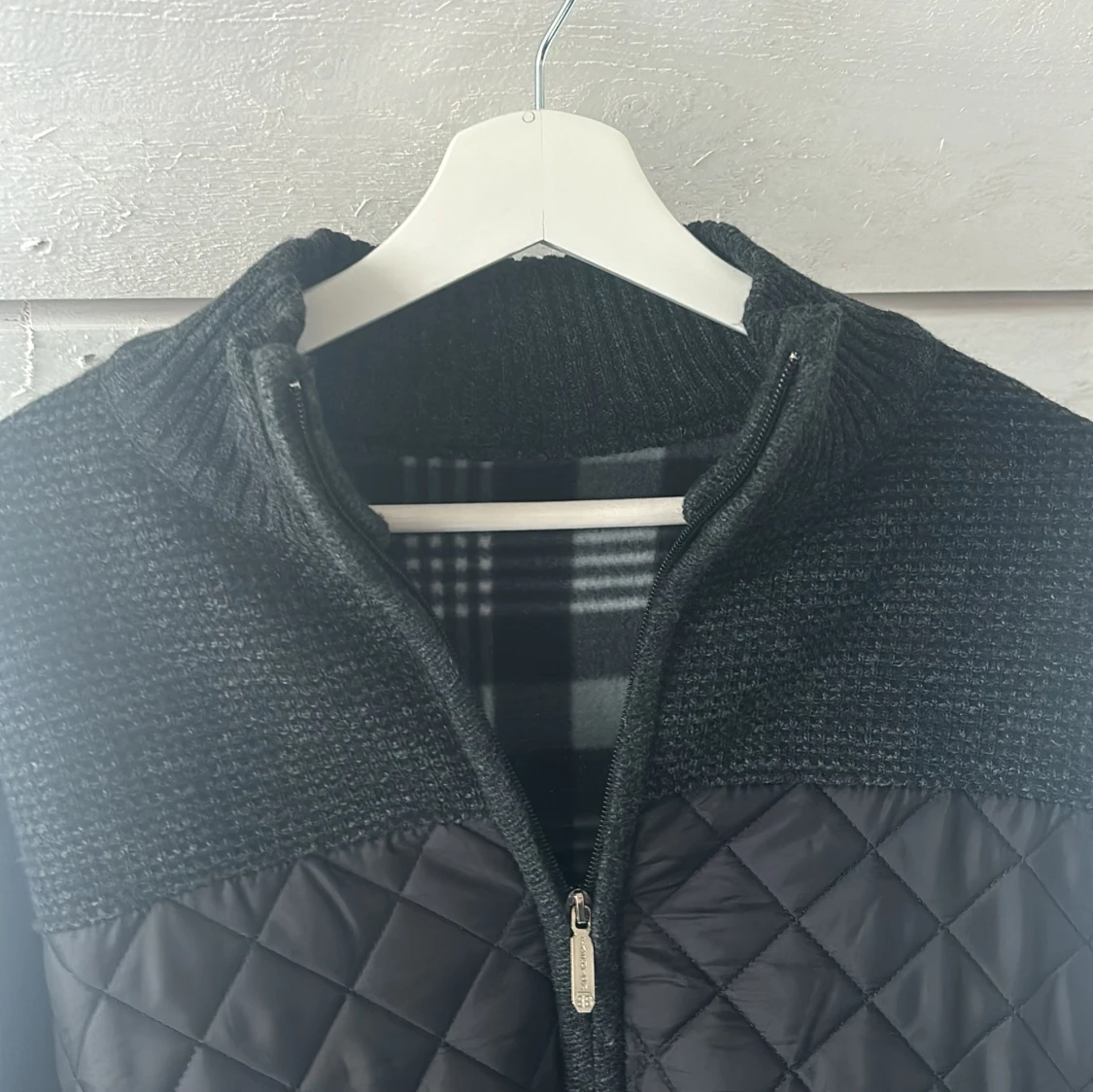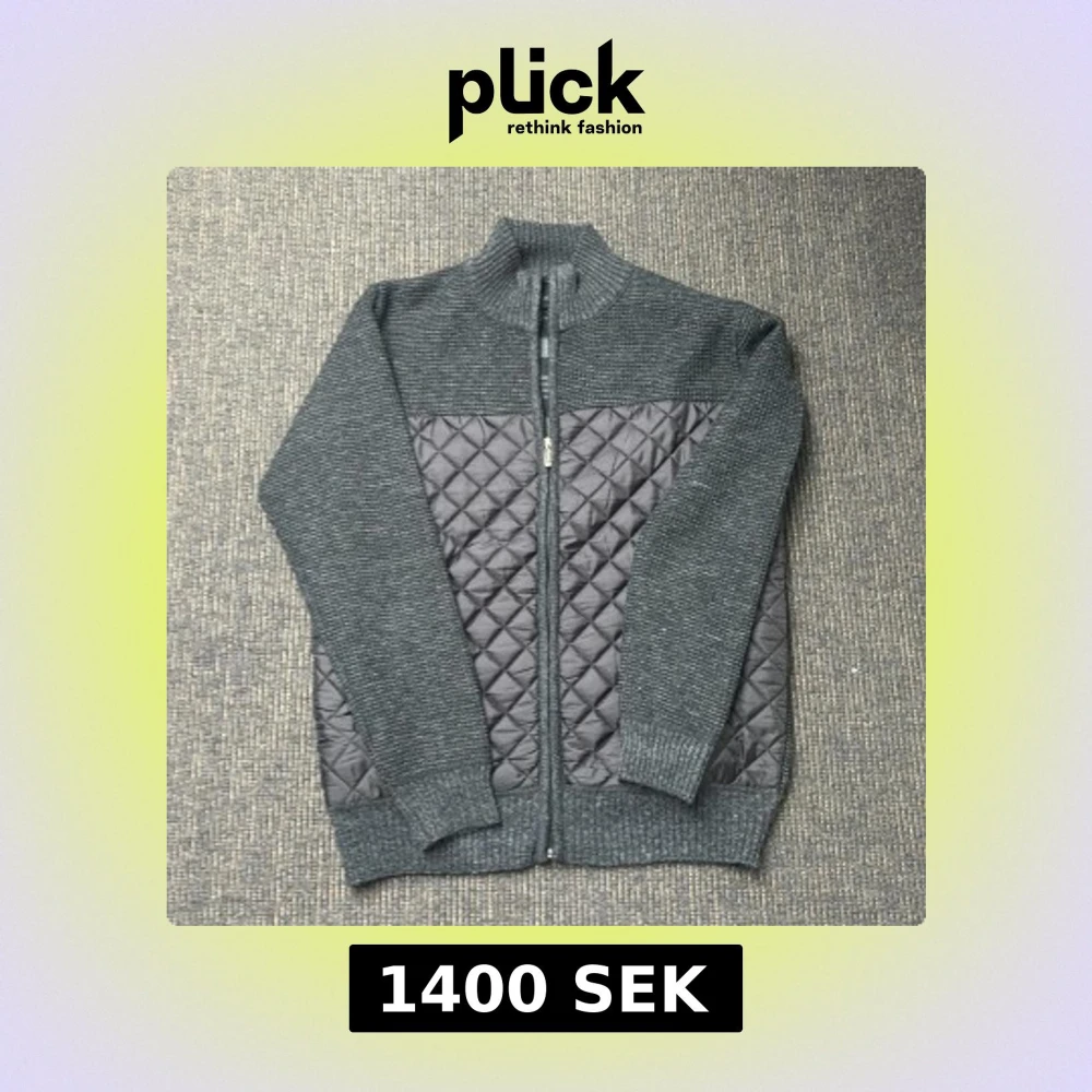 Säljer en stilren grå kofta med quiltade detaljer och dragkedja framtill. Insidan har ett rutigt mönster i svart och vitt sjukt unikt. Perfekt för kyliga dagar! Aldrig använd, sjukt bra kvalite!