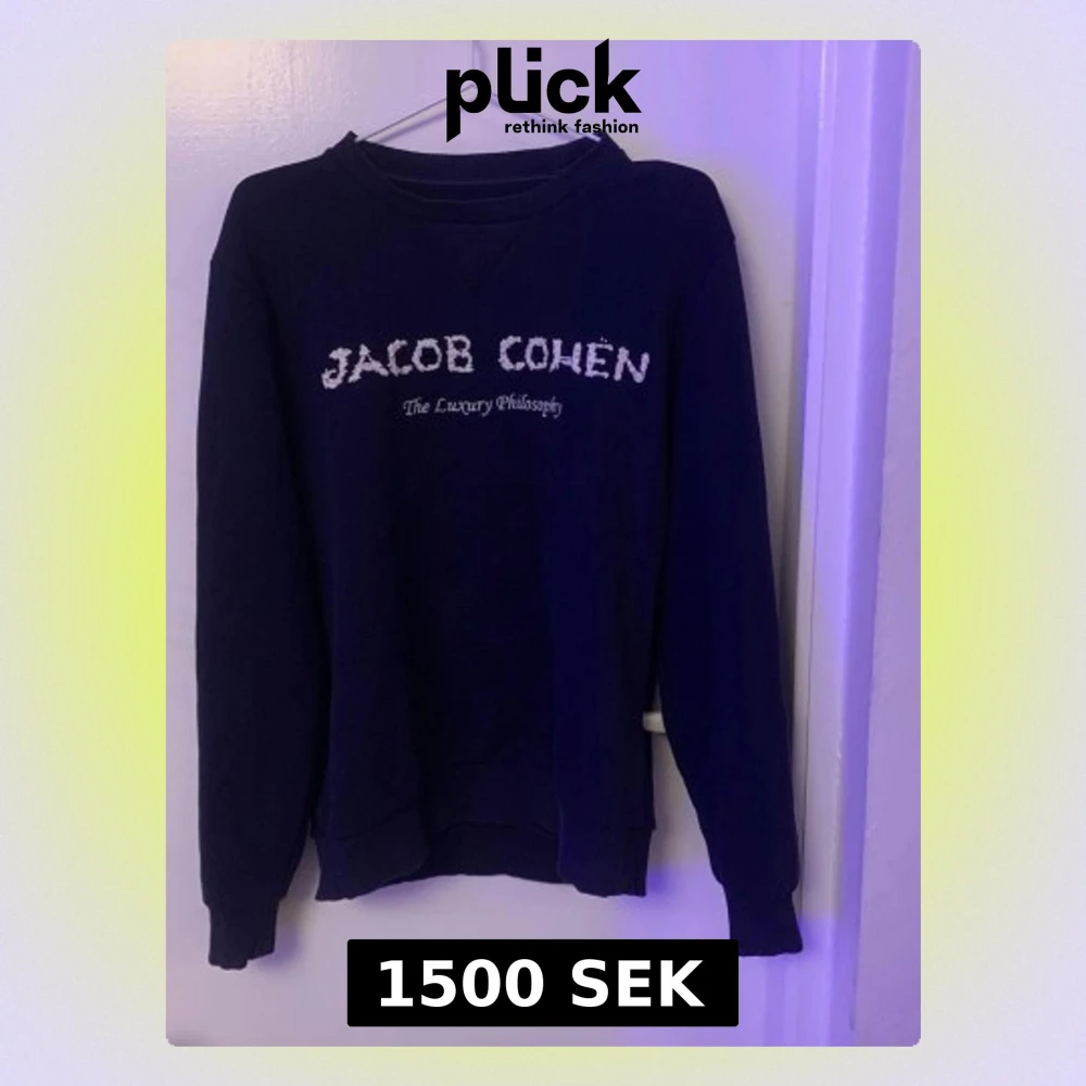 Säljer en mörkblå sweatshirt från Jacob Cohën med vit broderad logga och texten 'The Luxury Philosophy' på bröstet. Tröjan har rund hals, långa ärmar och ribbade muddar. Perfekt för dig som gillar stilrena och exklusiva plagg.