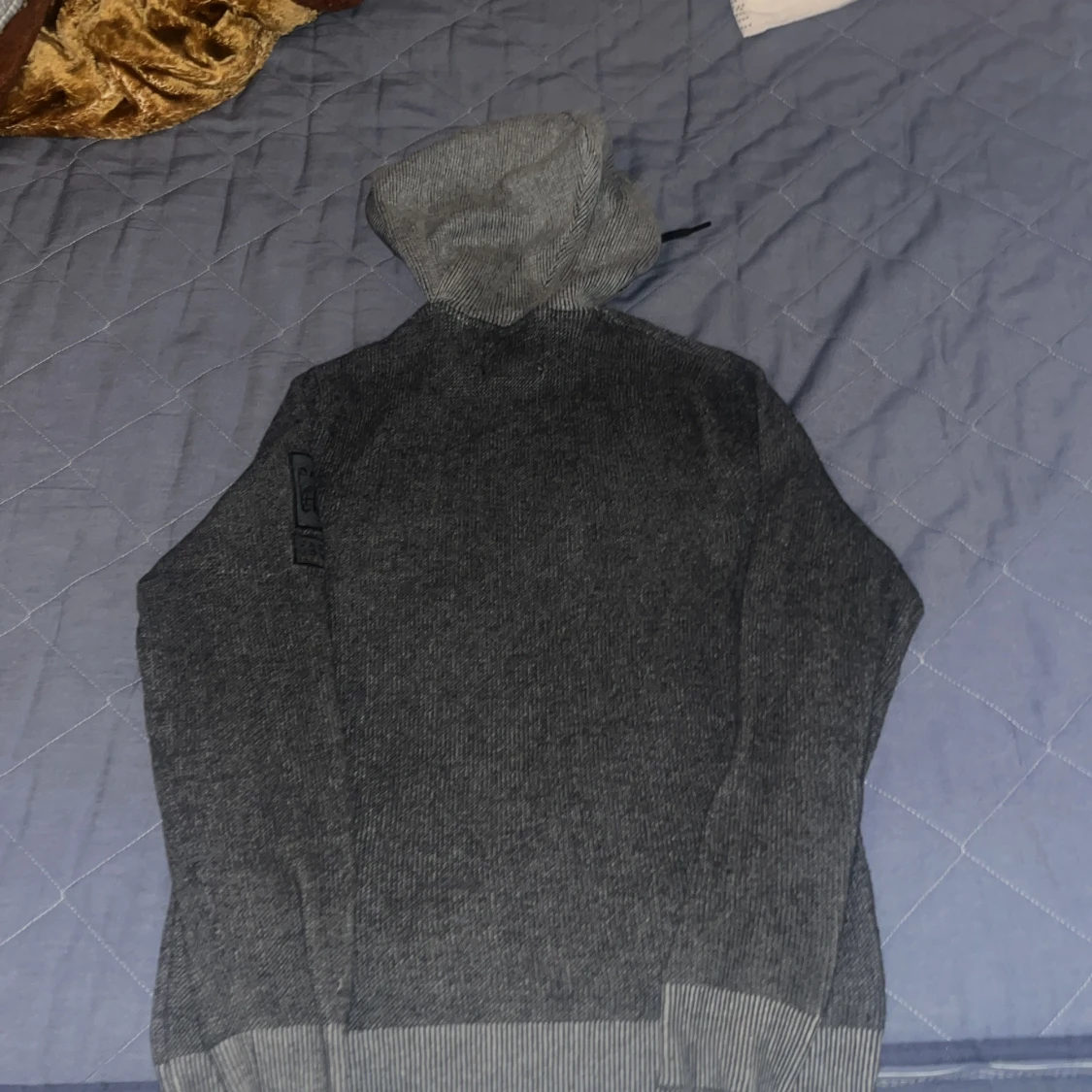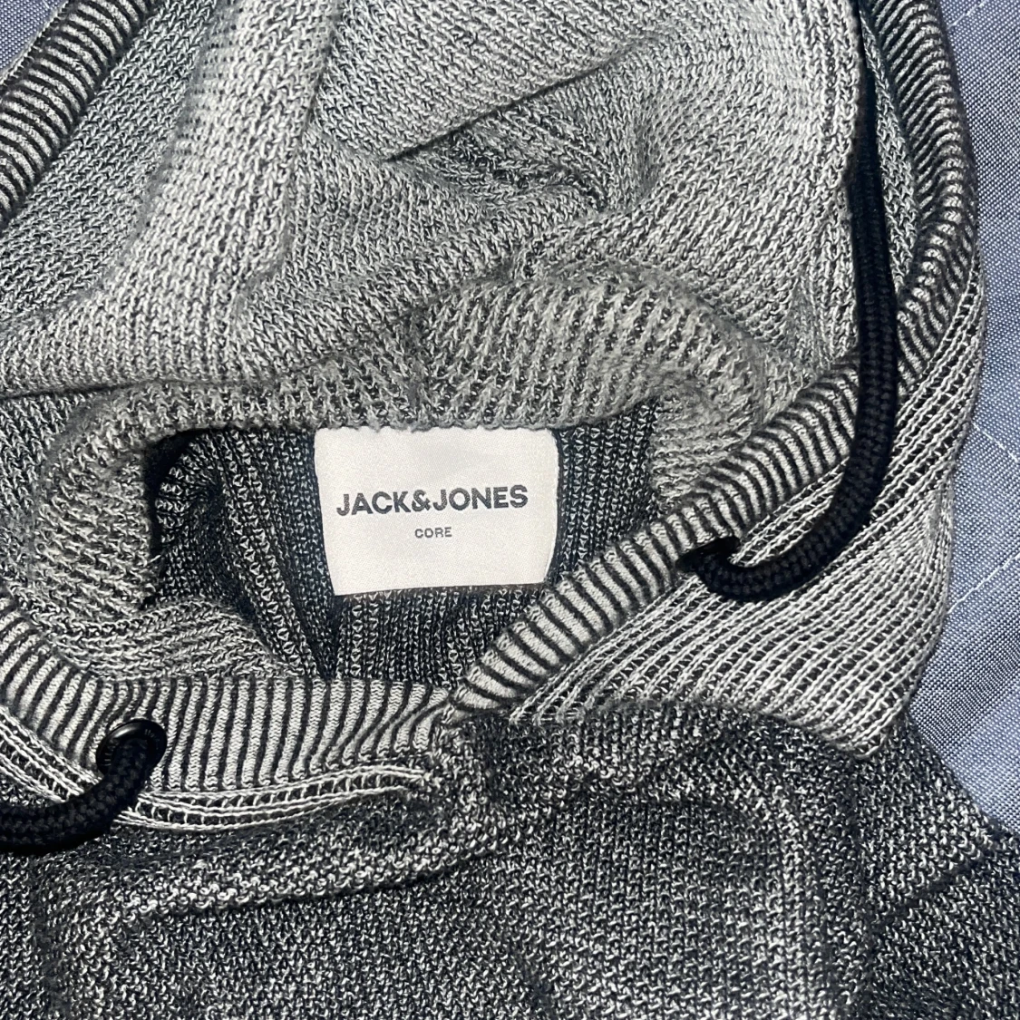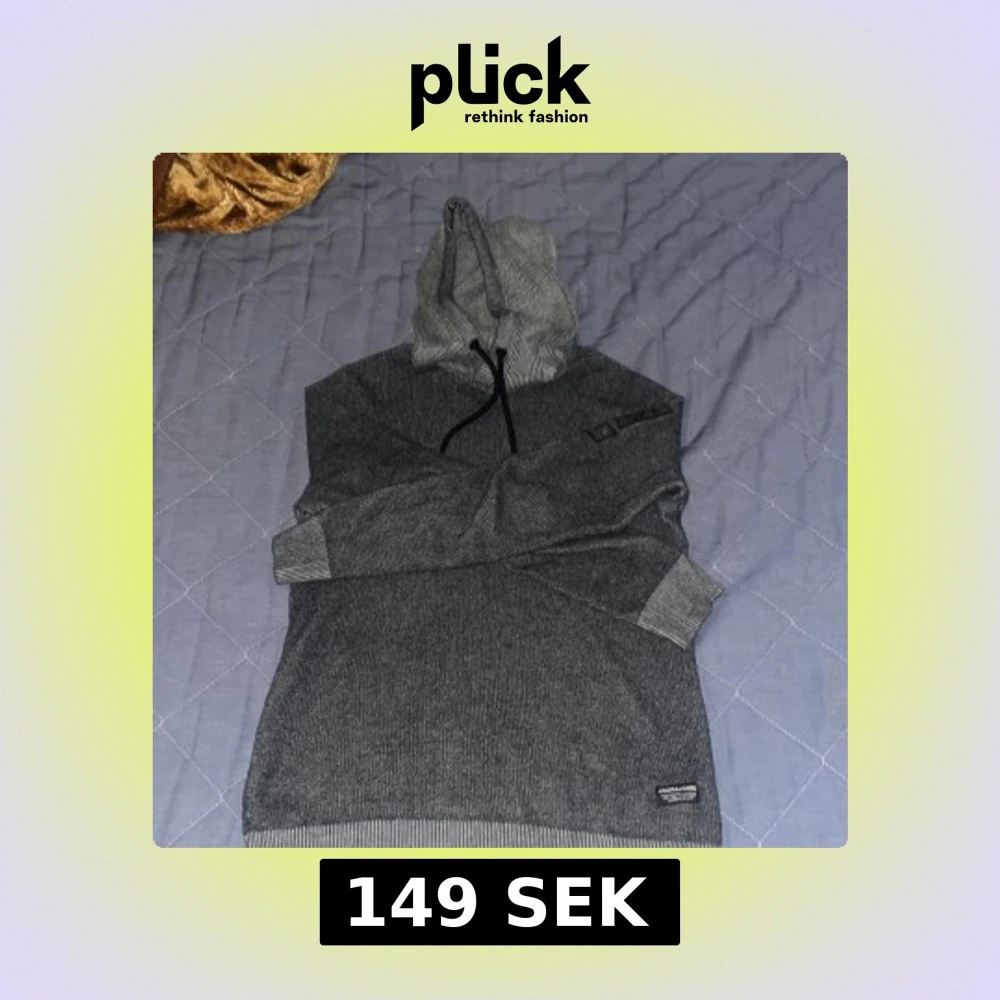 Säljer en stilren grå hoodie från Jack & Jones. Den har en justerbar huva med svarta snören och ribbade muddar vid ärmslut och nederkant. Perfekt för en avslappnad look. Skick är 8/10.