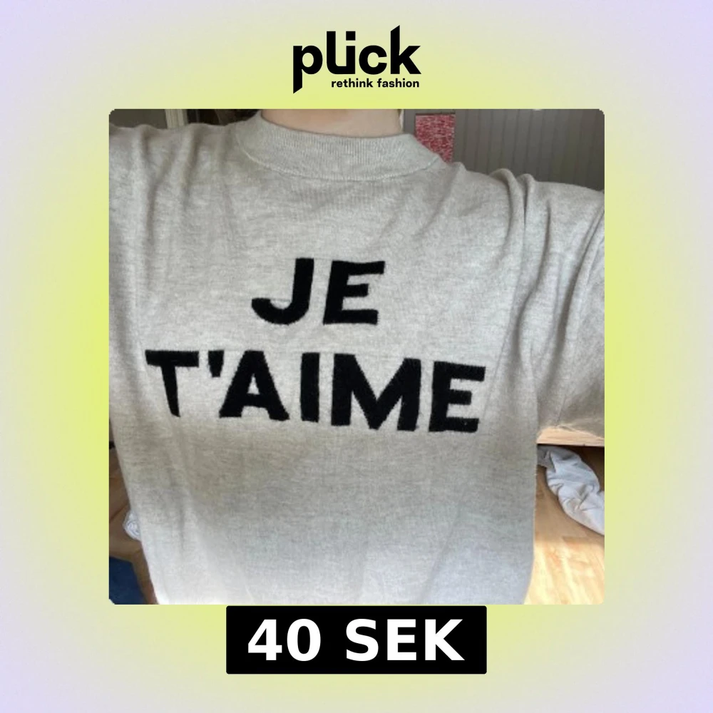 Säljer en ljusgrå tröja från Gina Tricot med svart text 'JE T'AIME' framtill. Tröjan har rund halsringning och långa ärmar, perfekt för dig som gillar en chill och enkel stil. Materialet är mjukt och skönt, passar till allt.