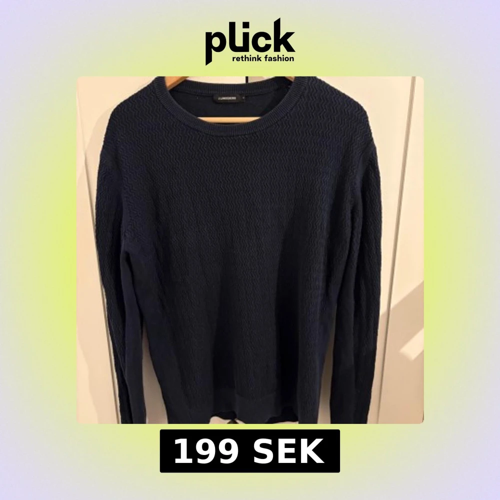 Säljer en mörkblå stickad tröja från J.Lindeberg i storlek M. Tröjan har ett diskret vågigt mönster i tyget och rund halsringning. Perfekt för lager-på-lager och passar till många olika stilar.