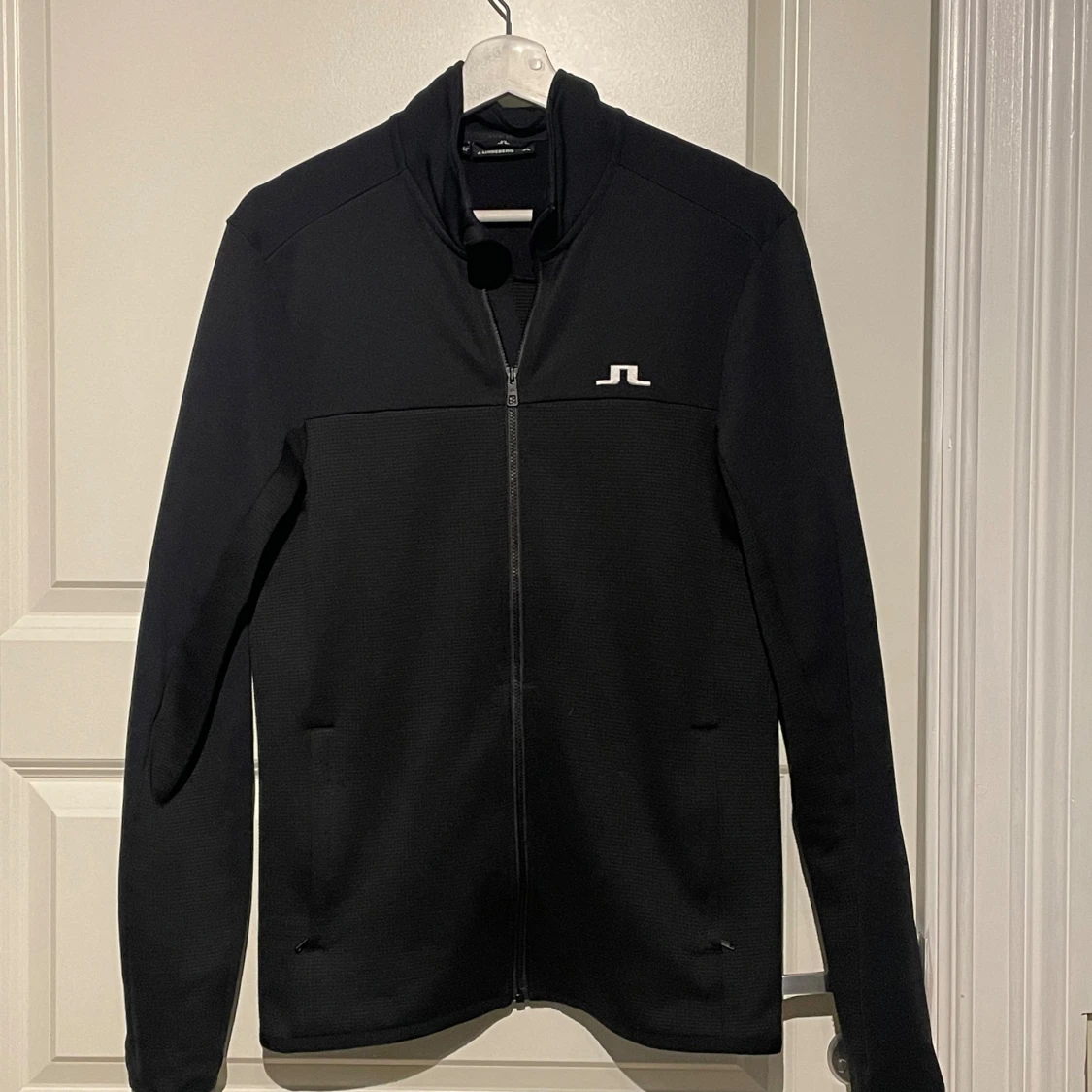 Svart långärmad ziptröja från J.Lindeberg med vit logga på bröstet. Tröjan har hel dragkedja framtill, ståkrage och två diskreta fickor. Materialet är mjukt och stretchigt, perfekt för en clean och sportig look.