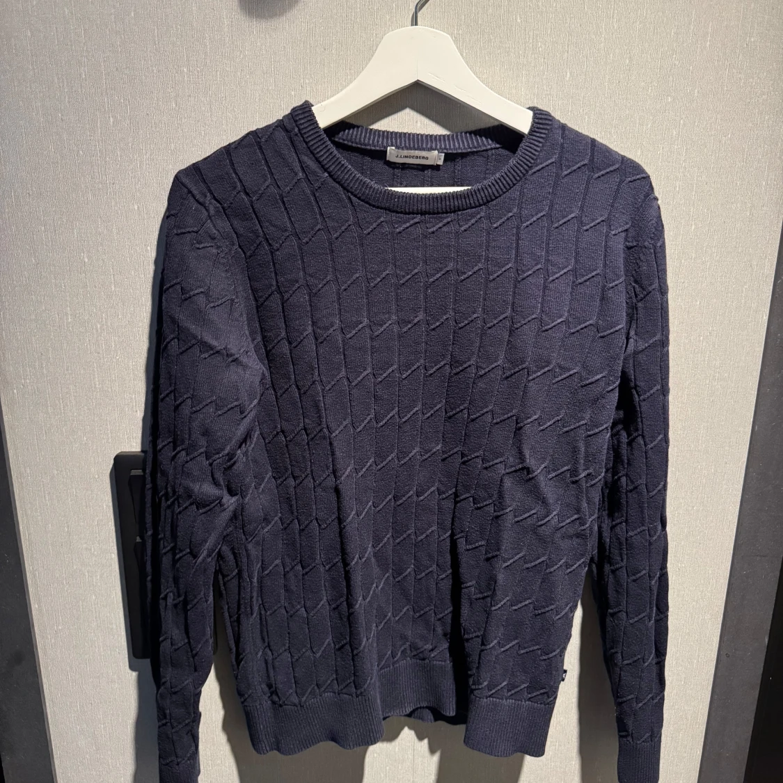 Snygg mörkblå stickad tröja från J.Lindeberg med coolt geometriskt mönster. Tröjan har rund halsringning, ribbade muddar och långa ärmar.