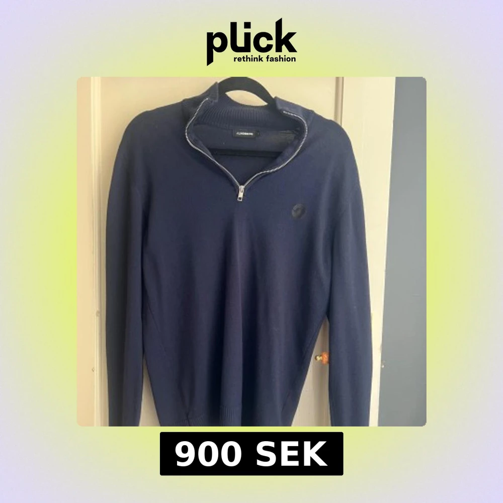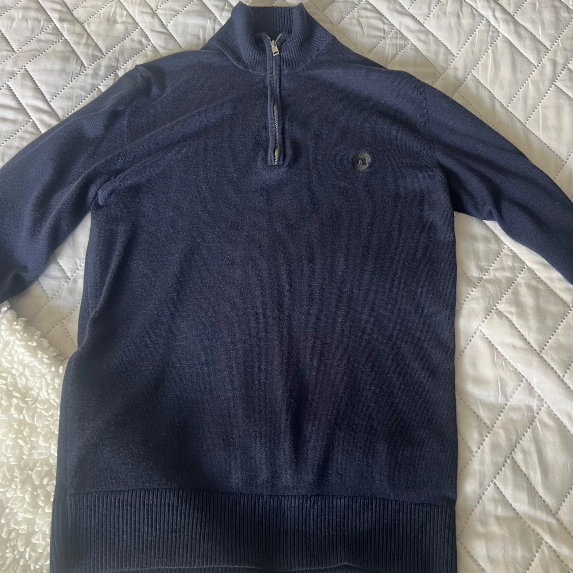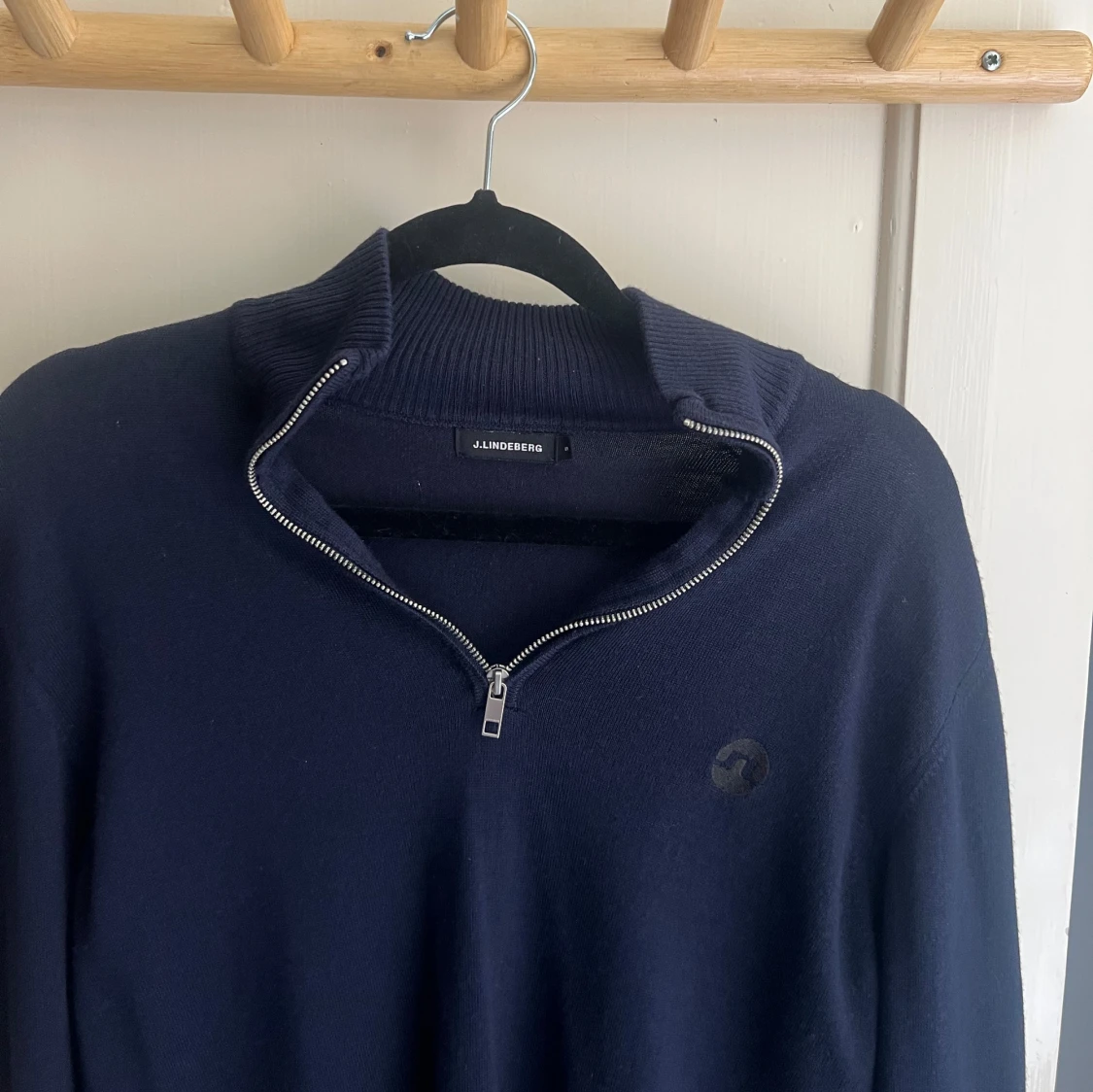 Mörkblå stickad tröja från J.Lindeberg med half zip och hög krage. Tröjan har diskret logga på bröstet och ribbade muddar vid ärmslut och nederkant. Perfekt för lager-på-lager och snygg till jeans eller chinos.