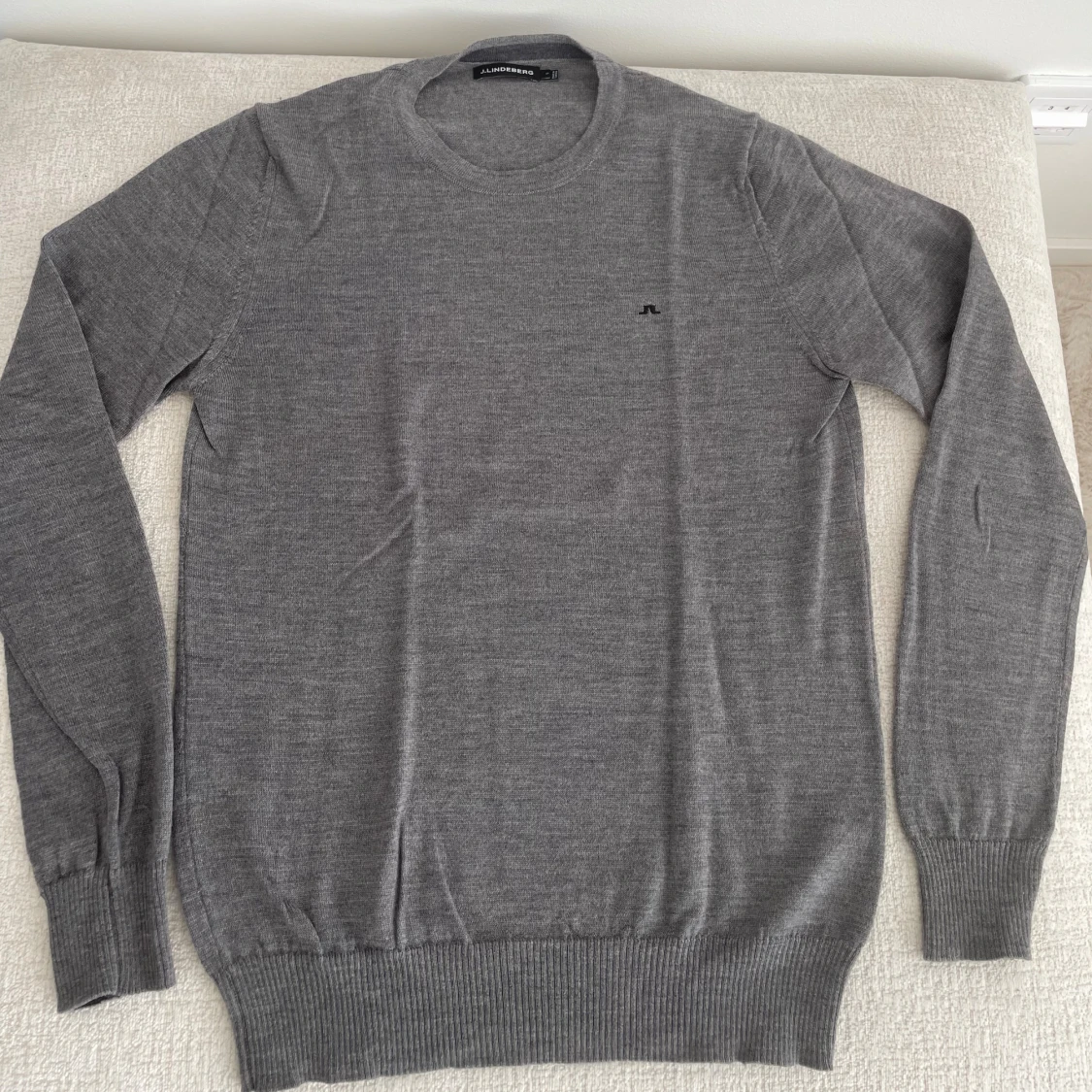 Snygg grå tröja från J.Lindeberg i mjuk merinoull. Klassisk rund halsringning, diskret logga på bröstet och ribbade muddar vid ärmslut och nederkant. Perfekt för lager-på-lager och stilren look.