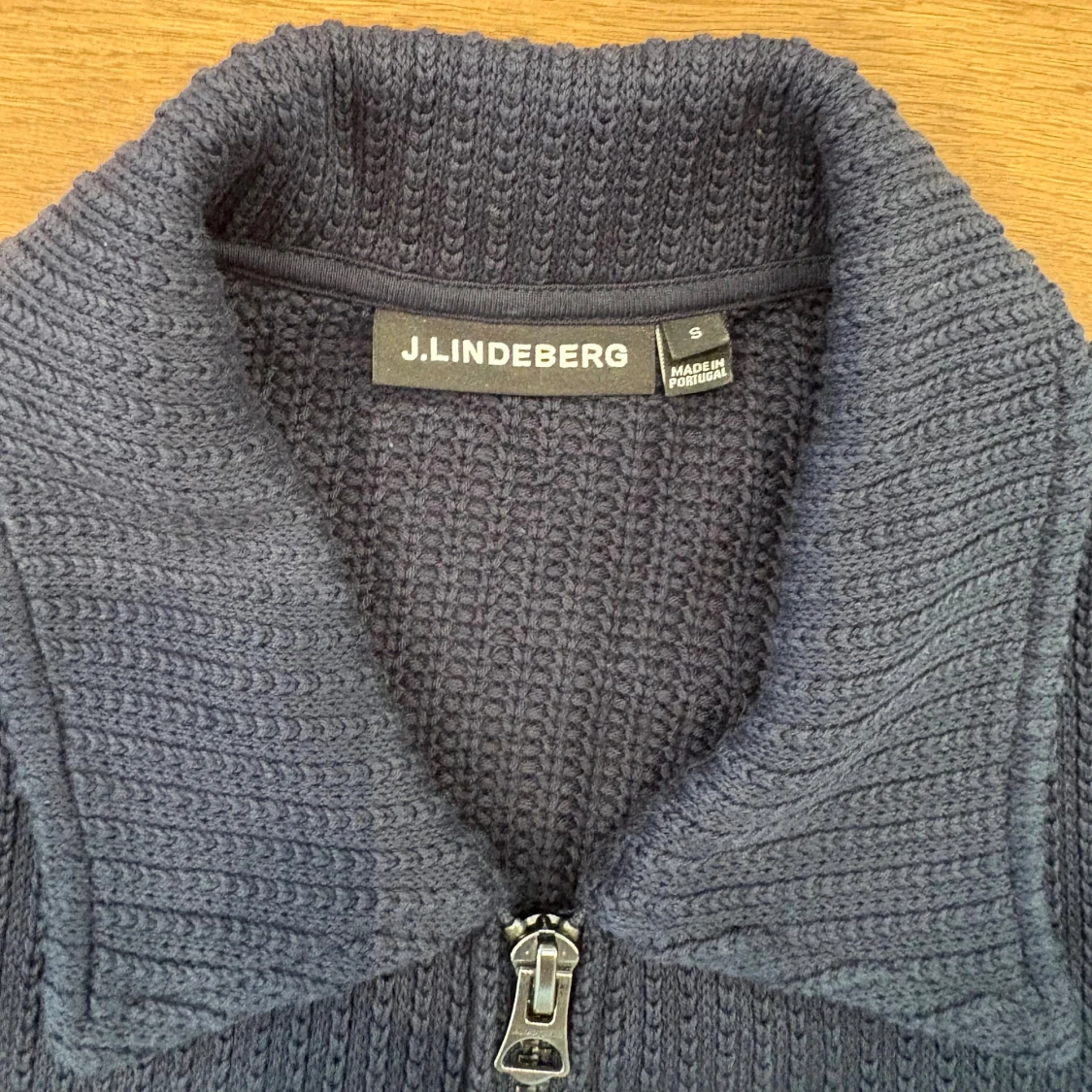 Säljer en marinblå cardigan från J.Lindeberg med hel dragkedja framtill och klassisk krage. Den är i nyskick och aldrig använd! Storlek S.