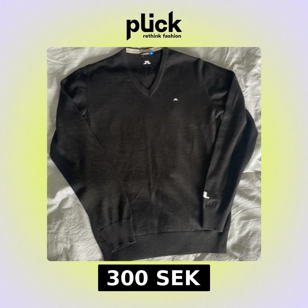 Nypris 1400, Klassisk svart v-ringad tröja från J.Lindeberg med diskret logga på bröstet och nacken. Tröjan är ribbad vid ärmslut och nederkant och har en stilren design som passar till mycket. Tillverkad i merinoull, ett tunt och mjukt material. Två små hål som syns vid utsidan av etiketten, se bild 4.