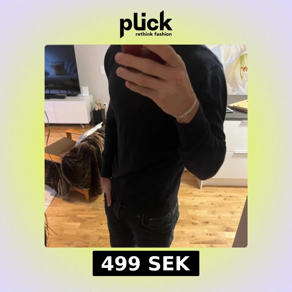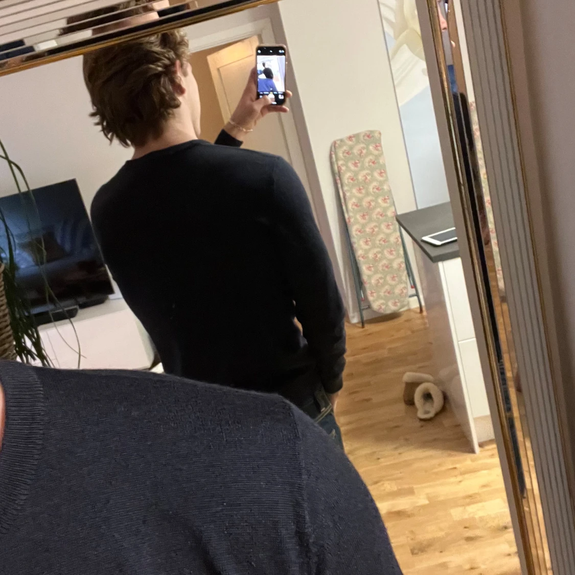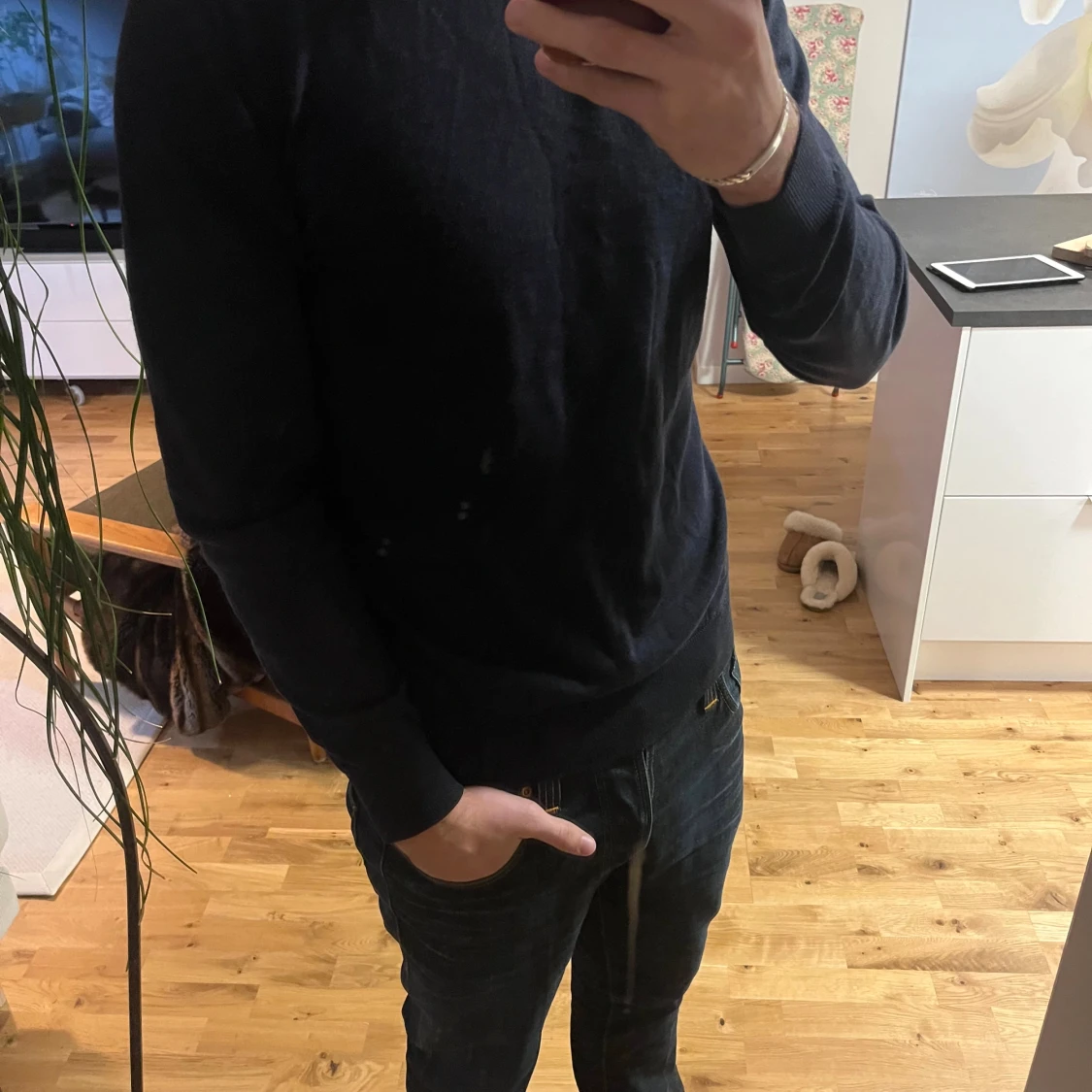 Säljer en stilren mörkblå stickad tröja från John Henric med rund hals och långa ärmar, perfekt nu inför kyligare dagar. Storleken är L men passar M också