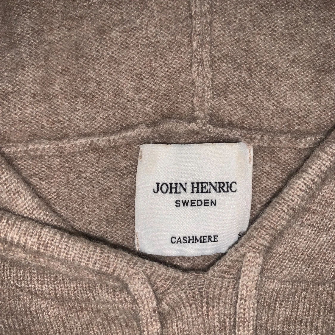 Mjuk och lyxig beige hoodie i 100% cashmere från John Henric. Tröjan har huva med snörning, känguruficka och långa ärmar. Perfekt för dig som vill ha en stilren och bekväm look med exklusiv känsla. Lagad i armbågarna men inget som syns vid användning