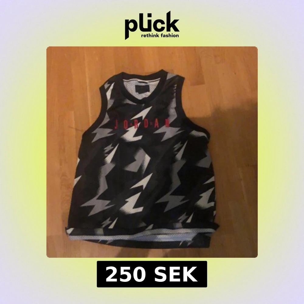 Snyggt basketlinne från Jordan i svart med grått blixtmönster och röd logga framtill. Stort vitt nummer 23 på ryggen. Tillverkat i luftig mesh med ärmlös design, perfekt för träning eller streetwear.