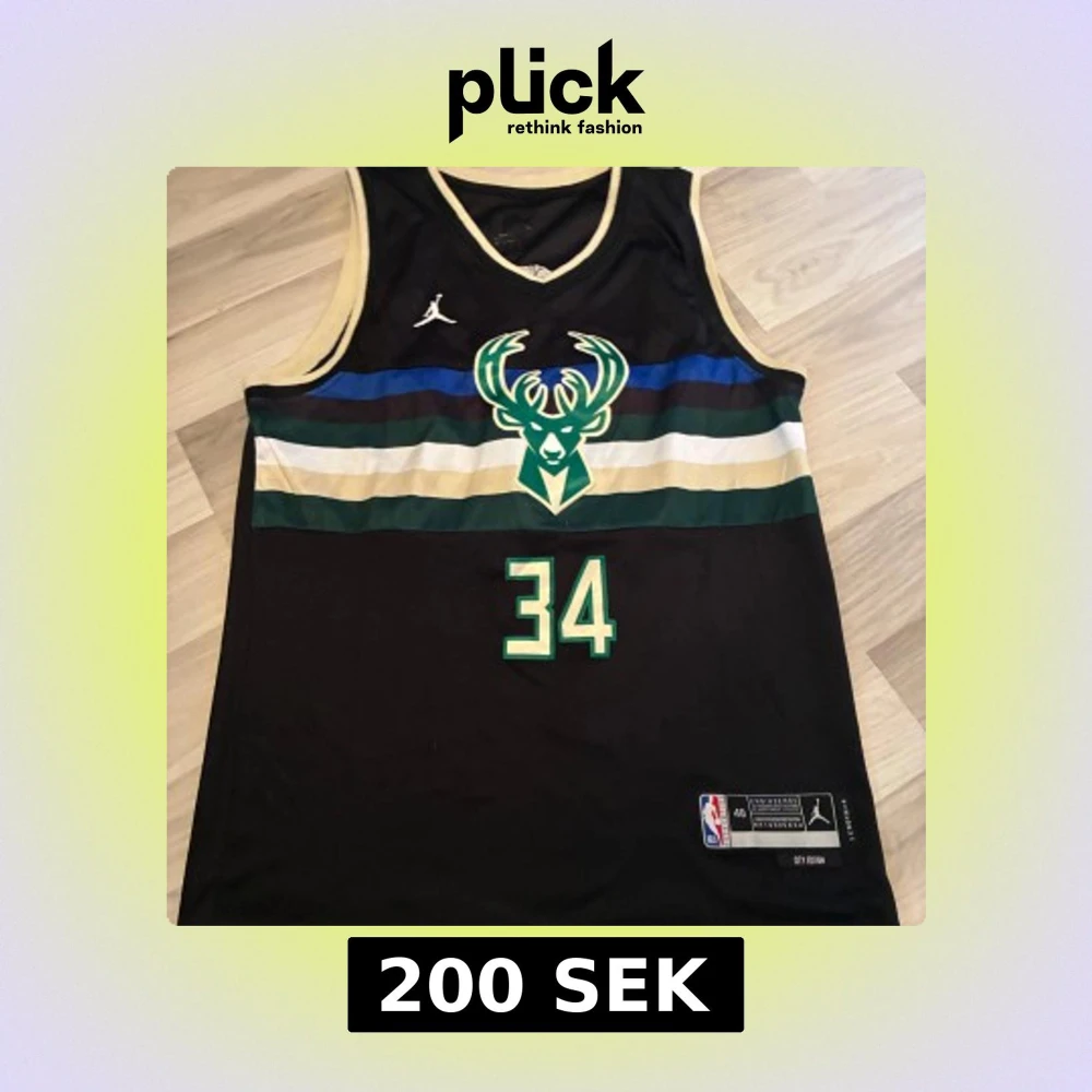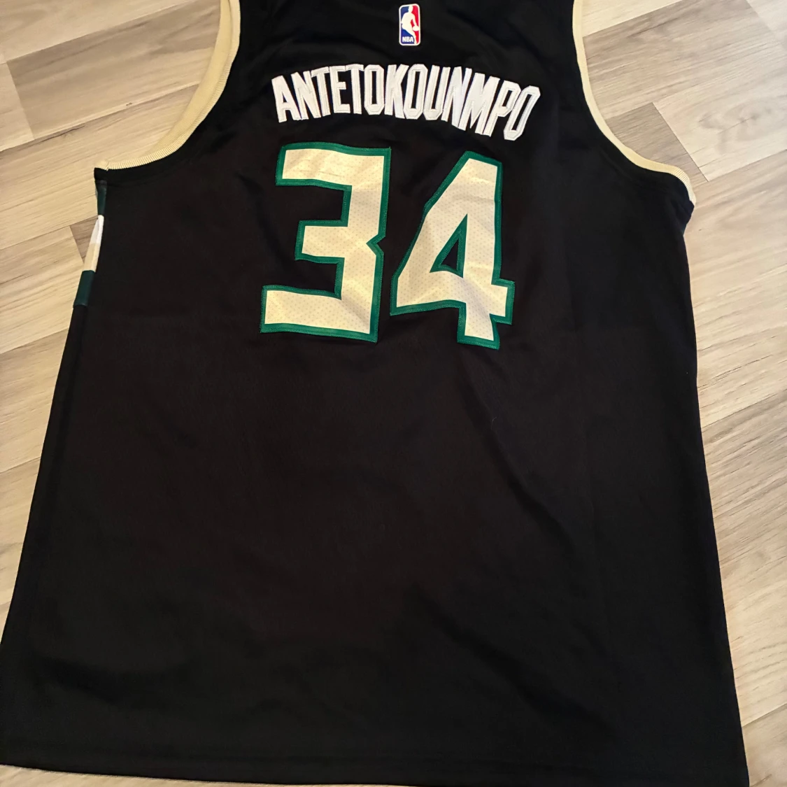 Snyggt Milwaukee Bucks basketlinne med nummer 34 och Antetokounmpo på ryggen. Svart bas med gröna, blå, vita och guldiga ränder över bröstet samt Bucks-logga. Tillverkat i lätt polyester, perfekt för basket eller streetwear.