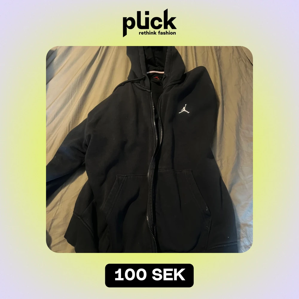 Säljer en svart hoodie från Jordan i bra skick. Den har en dragkedja framtill och en klassisk logga på bröstet. Perfekt för höst och vår, med en skön passform och fickor för extra bekvämlighet. Passar både till vardags och träning.