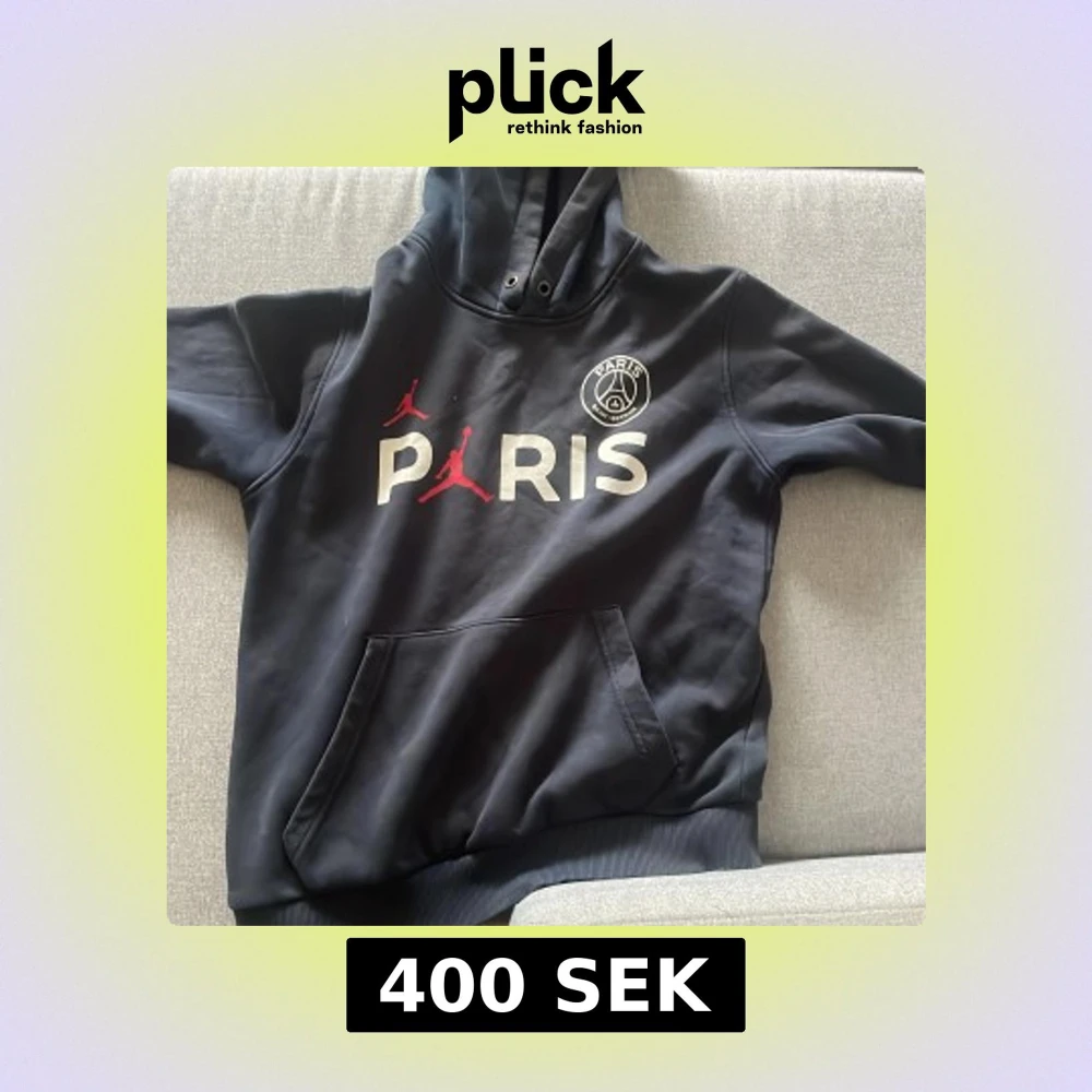 Säljer en svart hoodie från Paris Saint-Germain x Jordan med stor logga på ryggen och tryck framtill. Tröjan har huva, magficka och ribbade muddar. Perfekt för dig som gillar sportig streetstyle och vill sticka ut med snygg design.