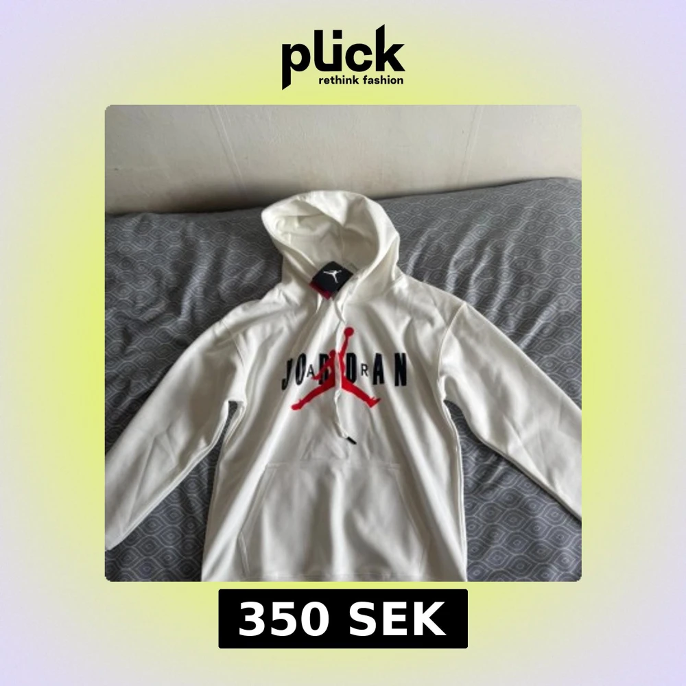 Snygg vit hoodie från Jordan med stor röd Jumpman-logga och svart text på bröstet. Tröjan har huva med snörning och en klassisk magficka. Perfekt för dig som gillar streetwear och sportig stil.