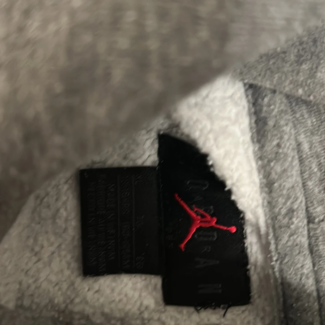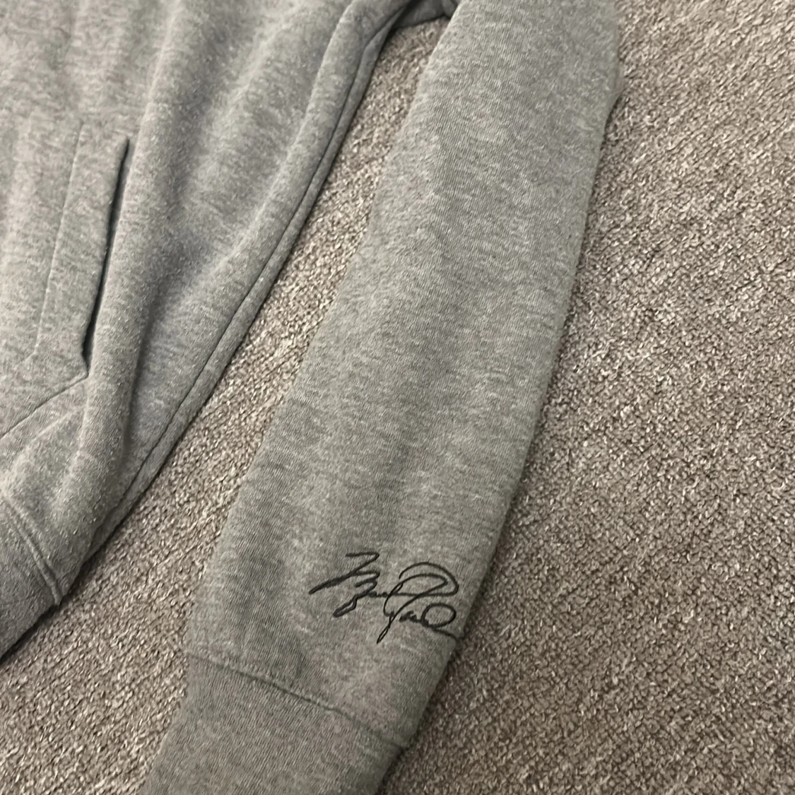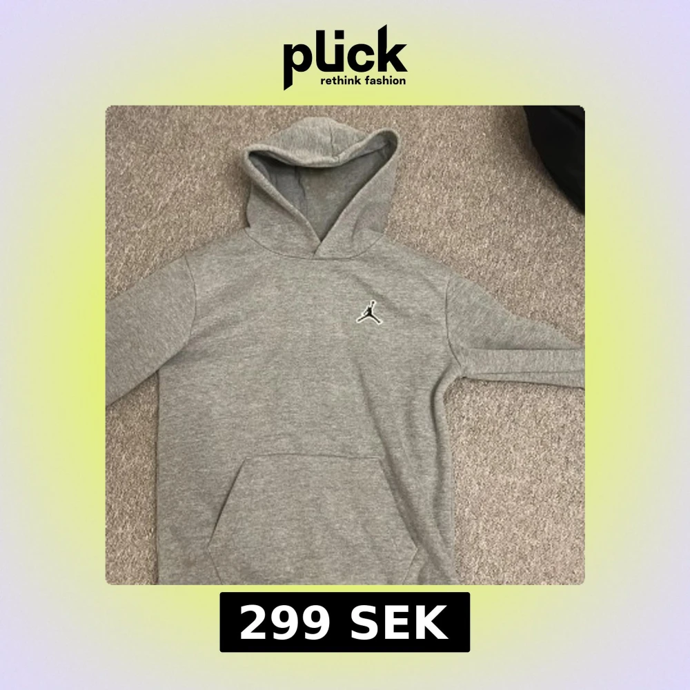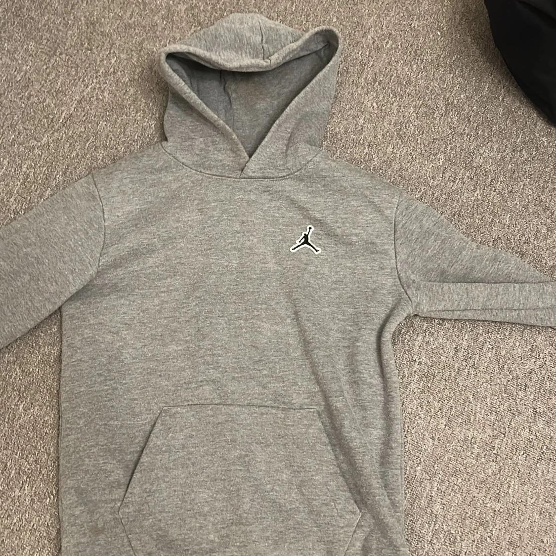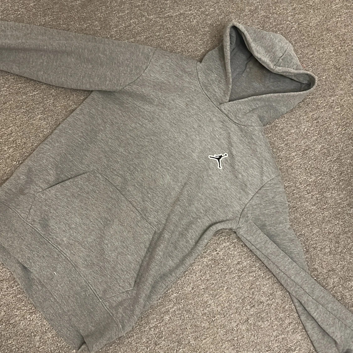 Säljer en grå hoodie från Jordan med en klassisk logga på bröstet och en signaturdetalj på ärmen. Tröjan har en stor ficka framtill och en bekväm huva. Perfekt för en avslappnad stil.