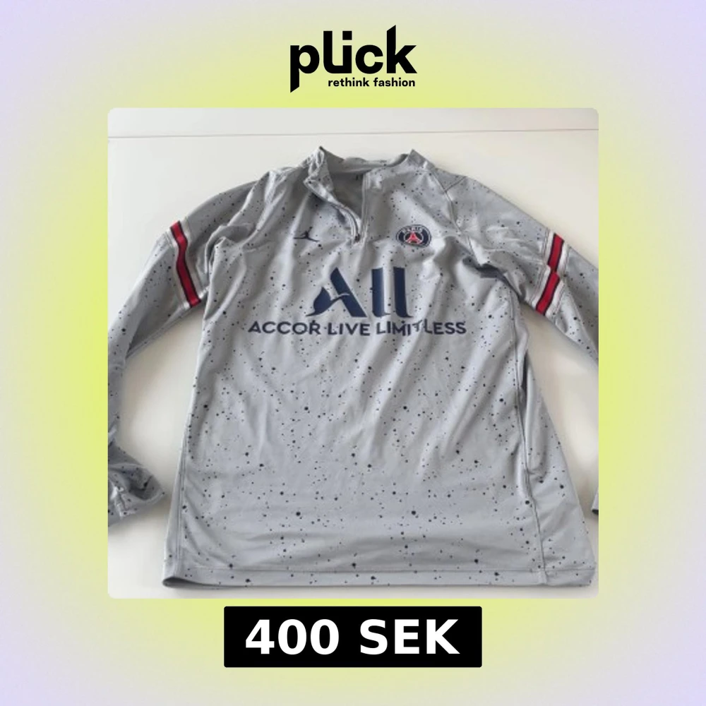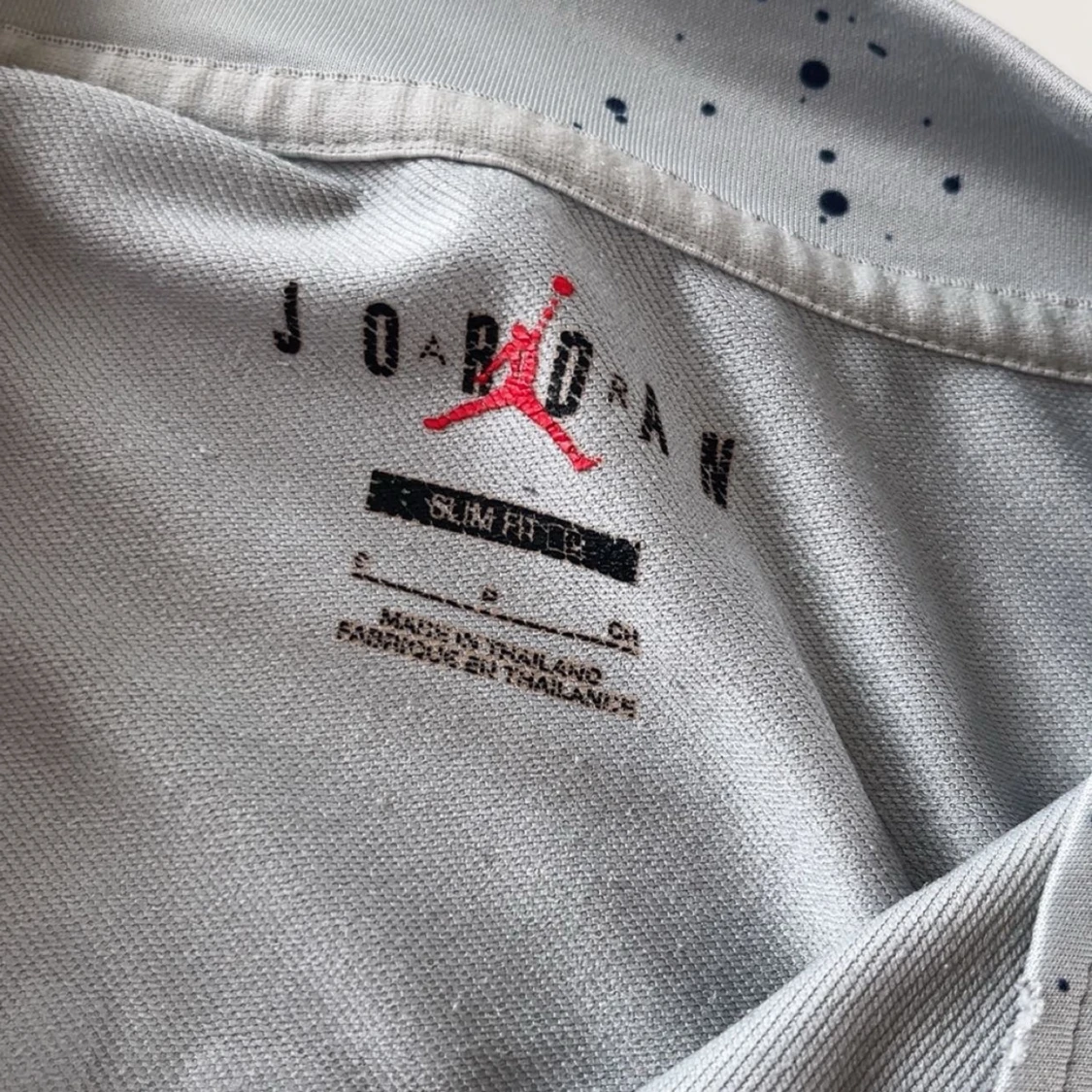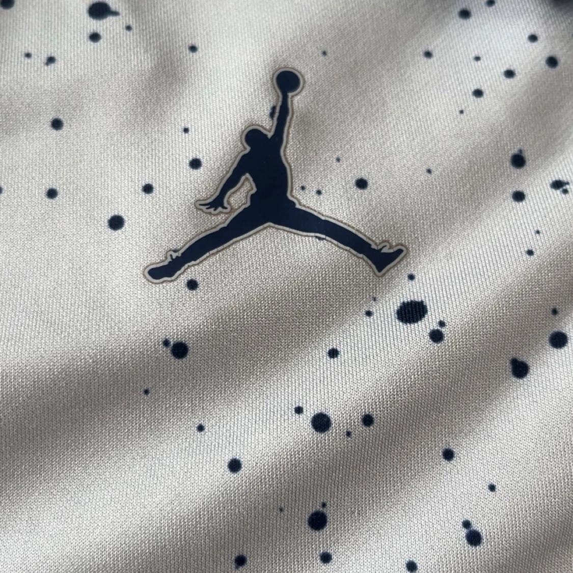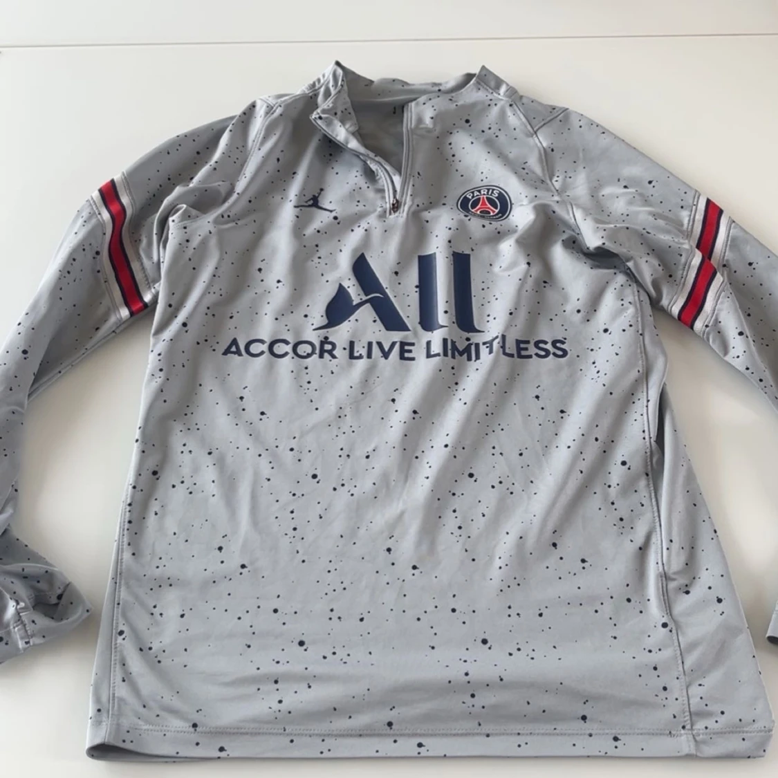 Snygg långärmad PSG fotbollströja från Jordan i ljusgrått med mörkblå stänk, broderad PSG-logga och Jordan Jumpman på bröstet. Tröjan har dragkedja vid halsen och röda detaljer på ärmarna. Tillverkad i lätt och ventilerande funktionsmaterial.