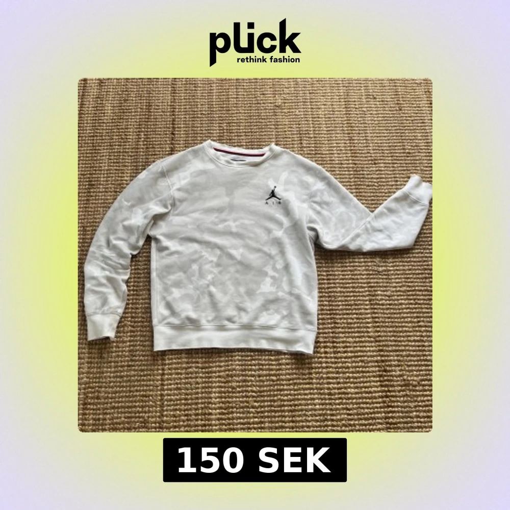 Säljer en vit sweatshirt från Jordan med diskret camomönster och klassisk Jumpman-logga på bröstet. Tröjan har rund halsringning och långa ärmar. Perfekt för en sportig och avslappnad stil.