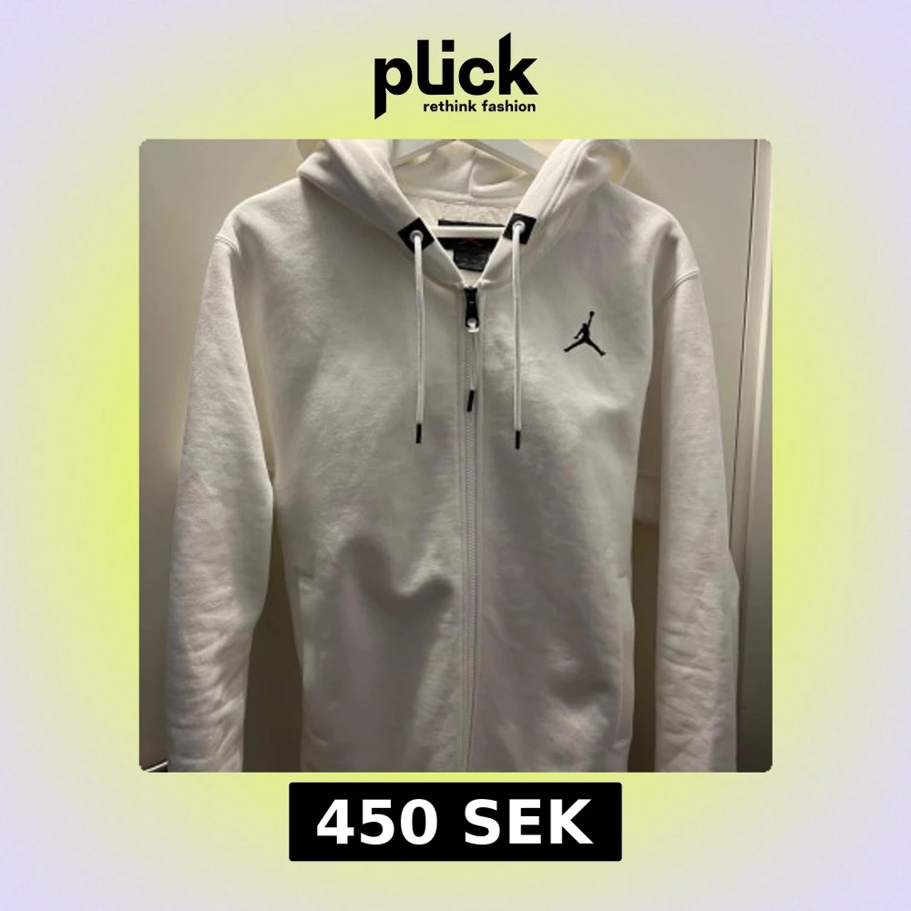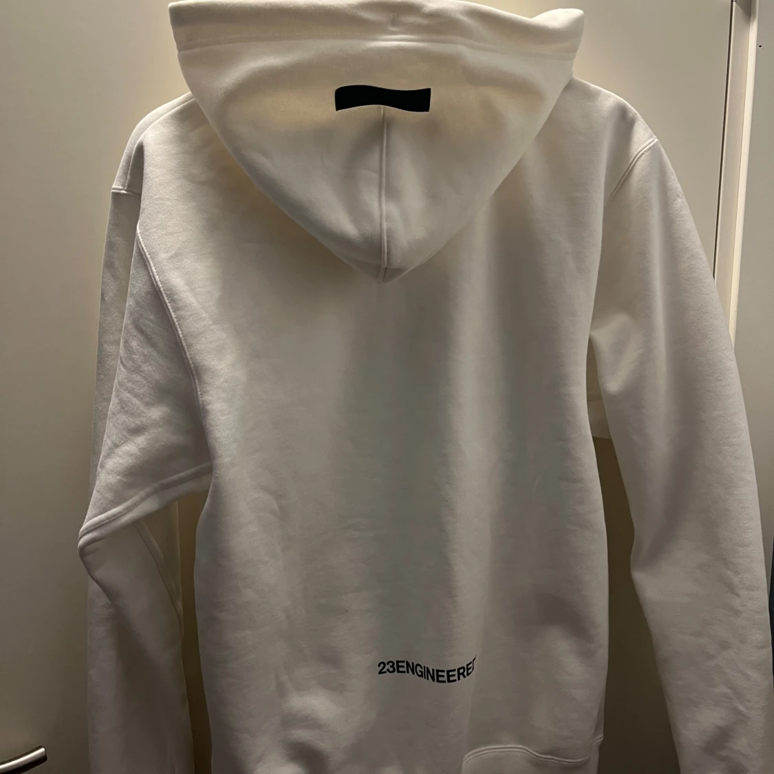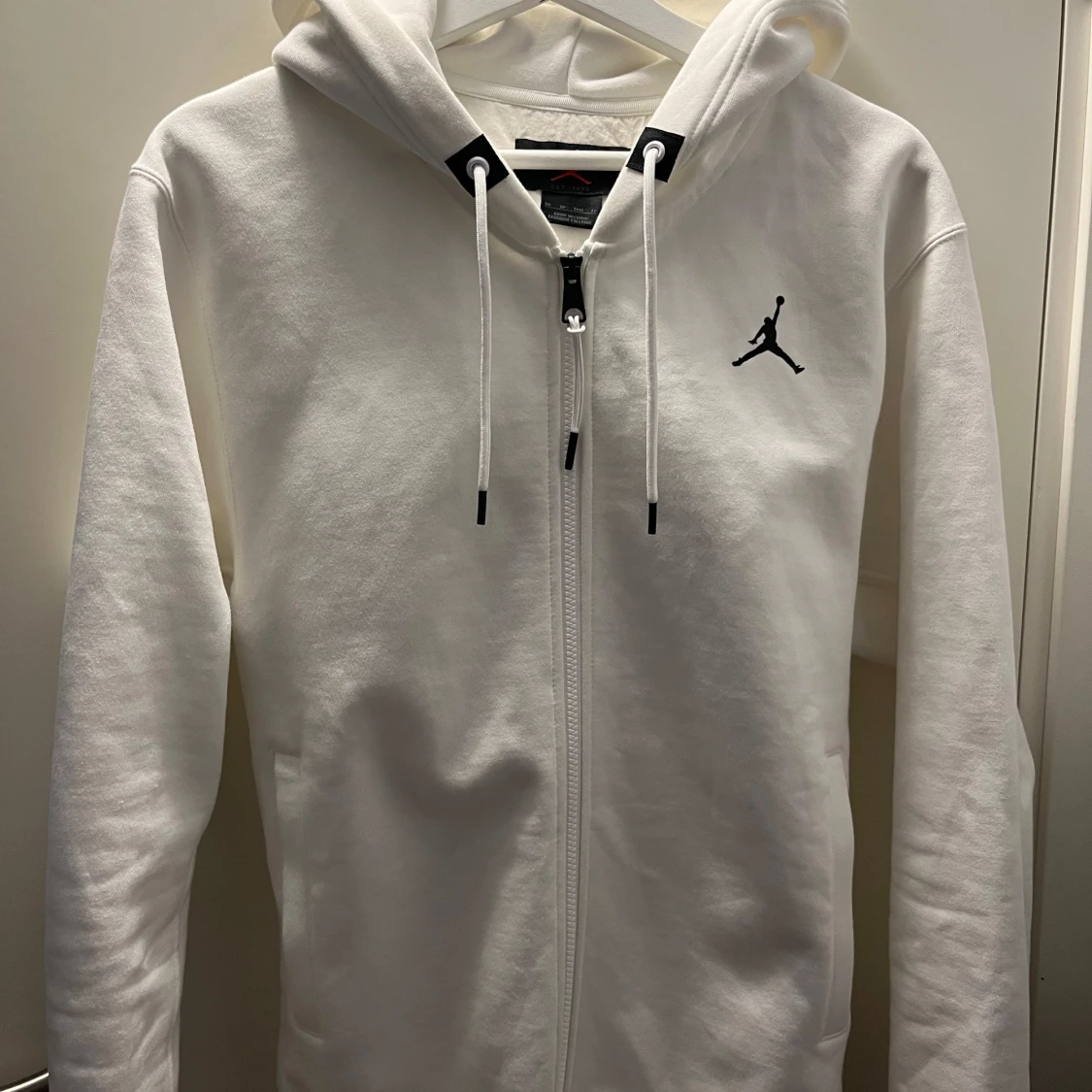 Säljer en fräsch vit hoodie från Jordan med svart Jumpman-logga på bröstet och texten '23ENGINEERED' på ryggen. Hoodien har snörning i huvan, hel dragkedja och långa ärmar. Perfekt för chill eller streetwear. Materialet är mjuk bomull och polyester.