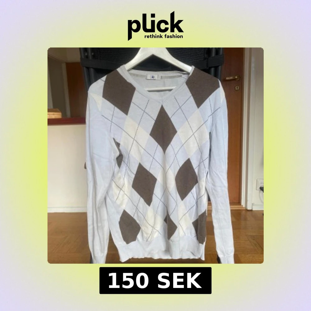 Snygg ljusblå tröja med klassiskt argylemönster i brunt och beige från JP. Tröjan har långa ärmar och en rund halsringning. Snygg och bekväm.