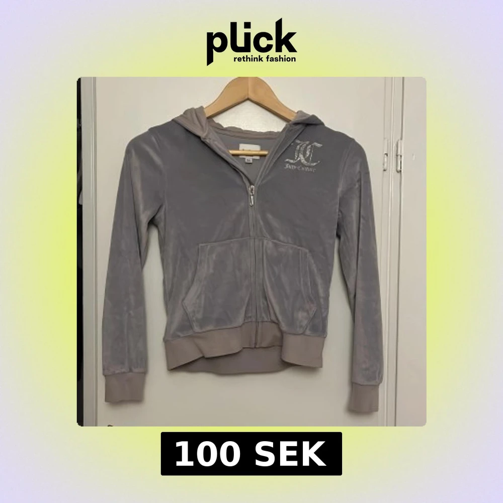 Supermjuk grå hoodie från Juicy Couture i velour med glittrigt silvertryck fram och bak. Trycket har blivit slitet som ni ser på bilderna men frf super fin passar strl 134-140. Klassisk huva, dragkedja och två fickor framtill. Perfekt för en chill och trendig look.