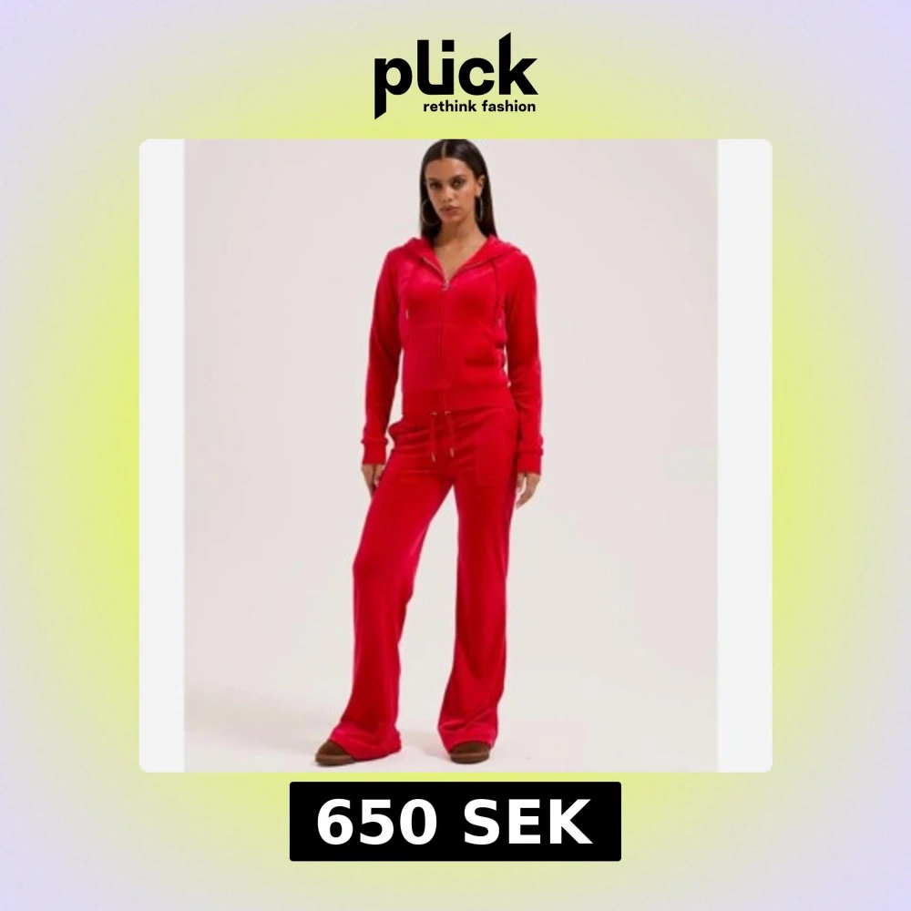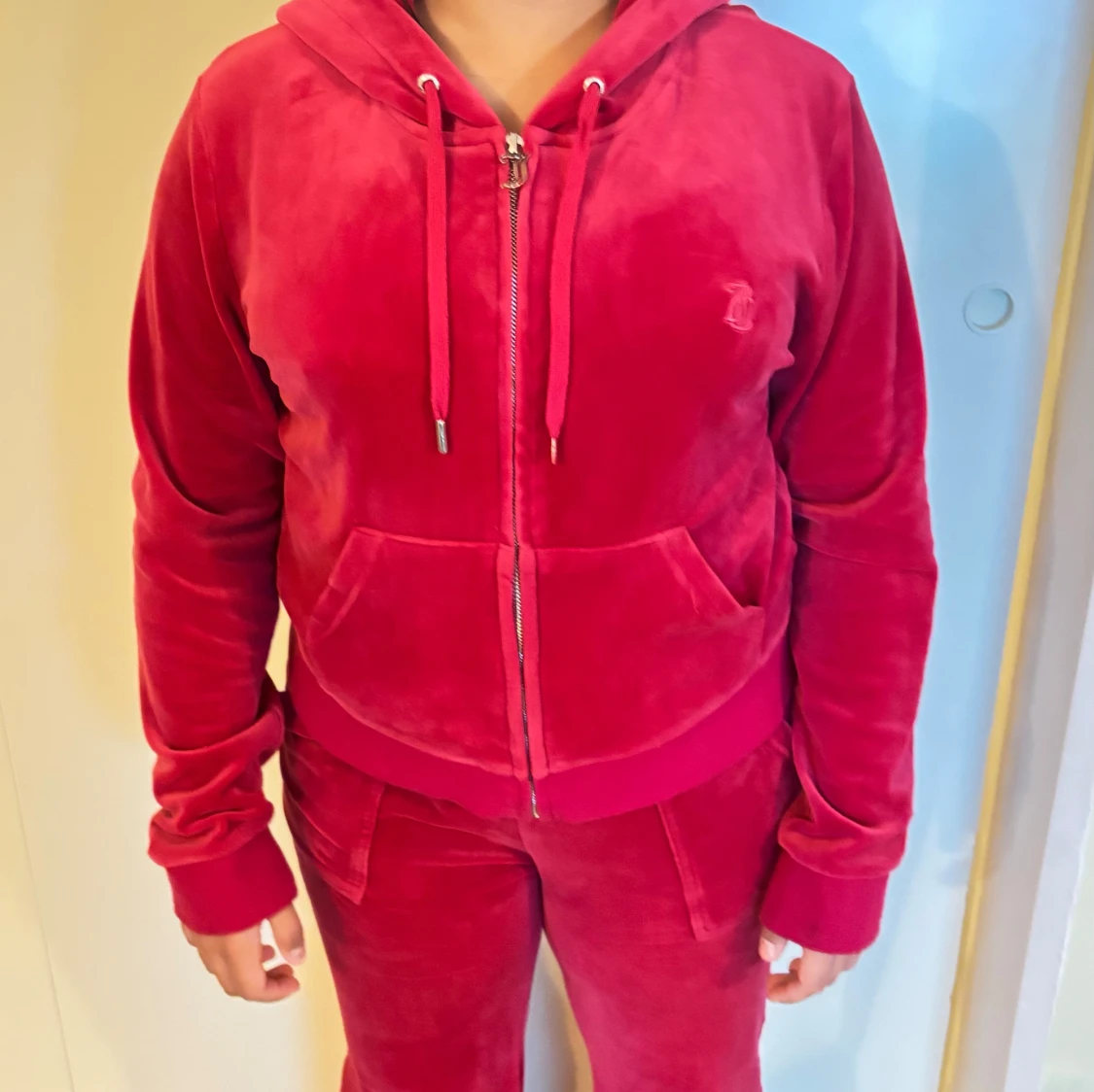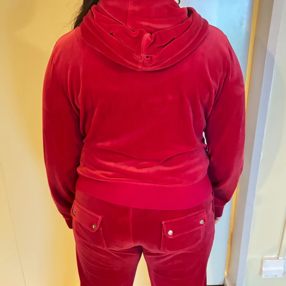 juicy couture röd sett ❤️Xl på byxan och L på koftan settet passar även till M settet är inte använd så många gånger ni kan se på bilden att den ser ny ut på koftan och byxan.