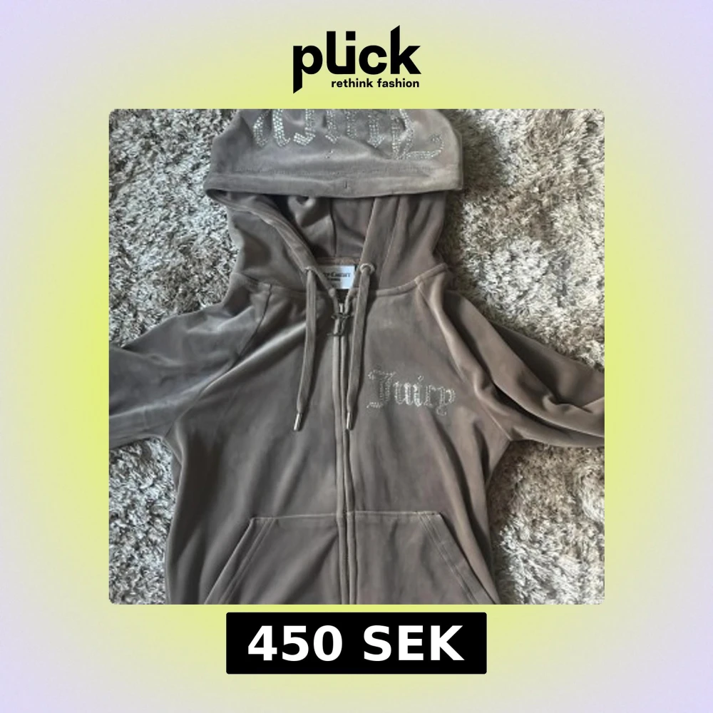 Säljer en jättefin beige velour/brun hoodie från Juicy Couture med glittrande stenar på bröstet och luvan. Jackan har dragkedja framtill, fickor och långa ärmar. Perfekt för en avslappnad och trendig look.